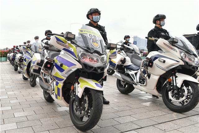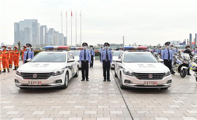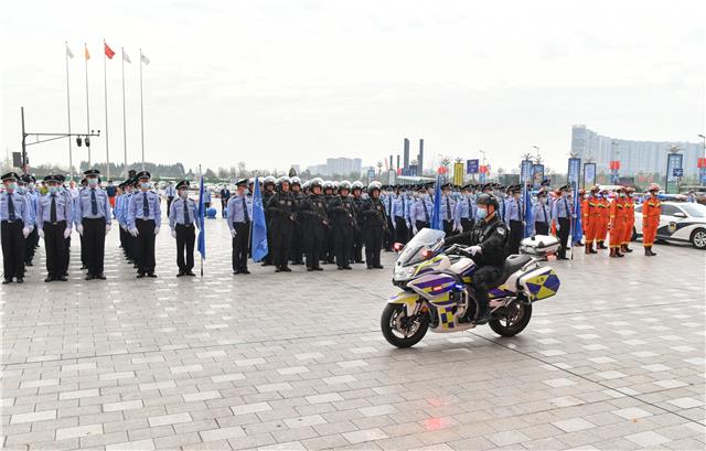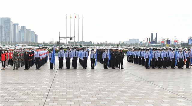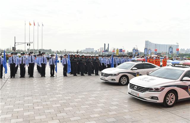 在誓师大会现场,公安民辅警、消防应急救援队伍、综治员、网格员、志愿者等各单位共200余人组队整装,警容严整。应急指挥车、防暴装甲车、警用无人机、铁骑摩托车、排烟车、云梯车、泡沫水罐消防车等警灯闪烁,蓄势待发。