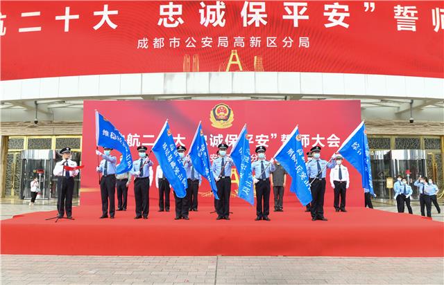 9月29日,成都高新公安分局在环球中心广场举行“护航二十大 忠诚保平安”誓师动员大会,动员全区警力以饱满的精神状态,为党的二十大胜利召开营造安全稳定的良好环境。