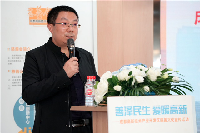 主题分享环节,成都高新好医生第一医院党支部、副院长梁朝富,成都高新区桂溪街道综合便民服务中心主任马兰、肖家河街道新光社区党委书记付毓强分别从企业、街道和社区层面介绍慈善参与成果,并分享了后续慈善工作计划。