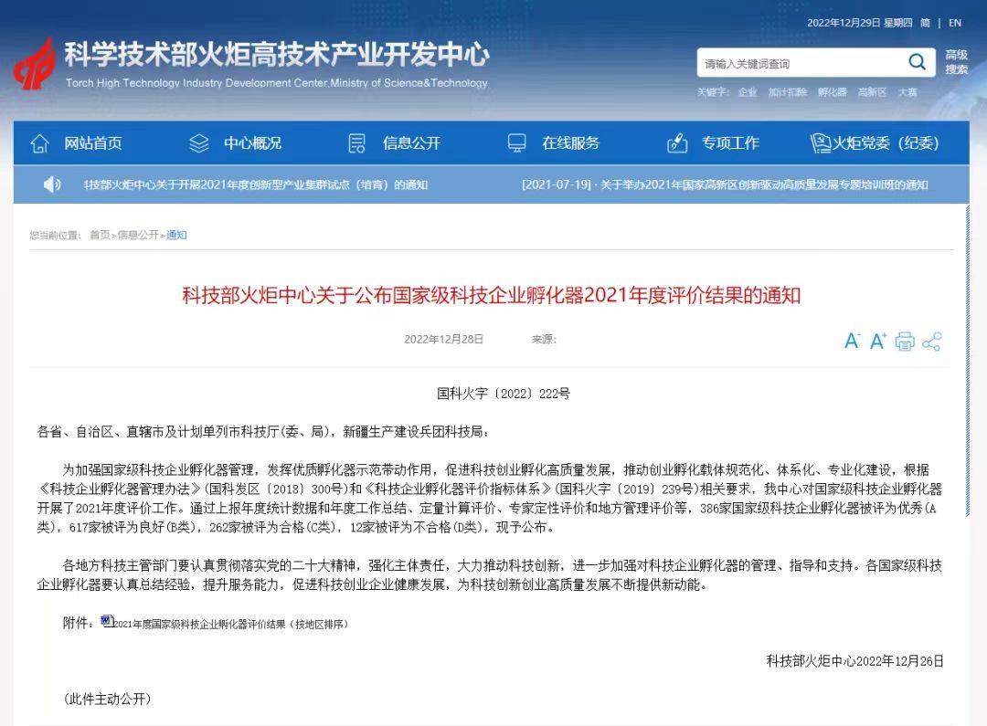 12月28日,科技部火炬中心公布了2021年度国家级科技企业孵化器认定结果,共评选出A、B、C、D四个等级的孵化器。成都天府软件园有限公司获评为国家级科技企业孵化器最高等级优秀(A类)。