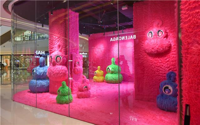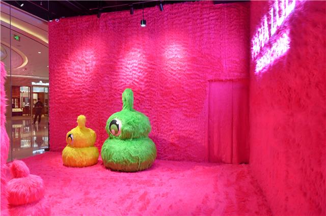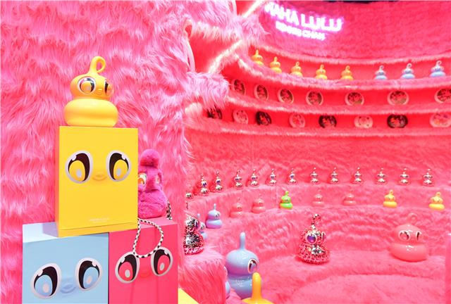记者在现场看到,每个展区各有创意和亮点,充满了吸引力。在“迷之好运·超现实迷宫展区”,以纱幕、镜子等介质,构成梦幻的“露露”迷宫;“一起追光·露露光雕展区”利用光影雕塑,用粉、黄、蓝、绿四种色彩的葫芦展现圆梦形象;在“心源宇宙·葫芦肚里卖什么药?”,360度环绕屏、全手工打造的HAHALULU水晶雕塑,在展厅中熠熠生辉;进入“未知之境·数字交互展区”,交互技术打造出光影交错、亦真亦幻的互动空间,让观者沉浸探索科技与艺术交融的全新场景;在“诗意山水梦·露露毛绒灯装置展区”,大小不一的露露像山峰一样错落分布,营造出温暖治愈的场景;在“大饱眼福·光影沉浸式主题餐桌”,餐盘成为艺术的全新载体,演绎一道HAHALULU养眼“川菜”;“绒化心事·露露毛绒世界”沉浸在软糯的氛围感中,毛绒玩具让人身心放松;在“露个脸·大型‘福禄打卡现场’”,巨型大“露露”、粉色毛绒墙、近6个人才能抱住的毛绒HAHALULU,成为“打卡”点位;“宝藏‘福禄’·露露生活方式区”,观众可以解锁飞盘滑板、毛绒包、毛绒灯等各种HAHALULU潮流单品;而在“HAHALULU灵感笑绒·多感官沉浸式café”里,坐下来点一杯主题特调咖啡,传统的孔明灯、漂流瓶等许愿场景将以数字艺术形式记录大家的愿望,存在展现于“露露”元宇宙中。