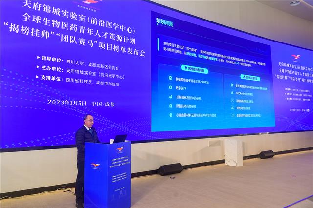 1月5日,天府锦城实验室全球生物医药青年人才策源计划“揭榜挂帅”“团队赛马”项目榜单发布会在成都高新区举行,天府锦城实验室(前沿医学中心)正式面向全球英才发布首批“揭榜挂帅”和“团队赛马”项目需求榜单。