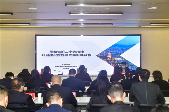 会上,朱常海博士作《学习贯彻党的二十大精神,开启世界领先科技园区建设新征程》专题讲座,围绕学习贯彻党的二十大精神和习近平总书记对国家高新区建设发展的系列重要指示精神,阐述了国家高新区的时代使命、经纬脉络和未来趋势,分析了成都高新区在新时代新征程和全国高新区“一盘棋”中的宏观形势、发展坐标和战略方位,启发学员联系实际深入思考“创建世界领先科技园区,我怎么干”。