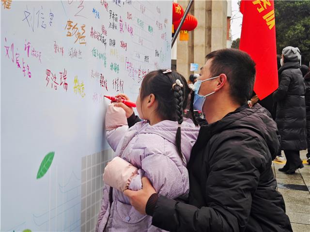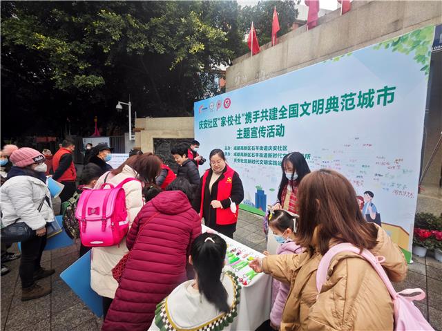 为深入宣传成都创建全国文明典范城市工作,提高辖区居民群众对创建全国文明典范城市工作的知晓率,营造共建共治共享良好氛围,2月13日,石羊街道庆安社区组织工作人员、网格员、志愿者纷纷化身“文明宣传大使”,联合庆安小学和石羊第十二幼儿园共同开展“家·校·社”文明知识进校园活动。用小手拉大手的方式倡导师生及家长不说粗话,不乱扔杂物,不乱贴乱画,不横穿马路,文明出行,从自身做起,点滴做起,以榜样的力量,引导带动更多家人自觉践行文明行为。活动吸引了大量的师生、家长积极参与,大家纷纷在倡议墙上留言作出承诺。