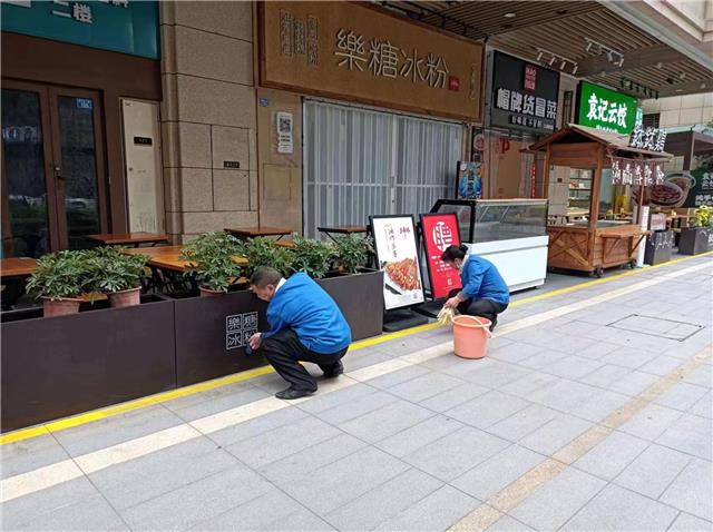 据了解,东寺社区辖区龙湖·九里晴川沿街有餐饮店、水果店、生鲜店、生活超市、外卖店等大大小小将近100余家商户,居民就近购物需求非常大。记者在该区域看到,周边的店面门口都有一条显眼的黄线和绿植花箱,距离店门口一米远,大部分的店家在线内摆放桌椅,整条街秩序井然。