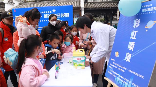 走进科学体验区,“怒发冲冠”“隐身屋”“彩虹喷泉”等各式各样妙趣横生的科普仪器和大型科普体验设备引入眼帘,现场宛然变成了一个小型的流动科技馆,引得居民朋友们纷纷上前亲手操作仪器,近距离感受到了科学魅力。