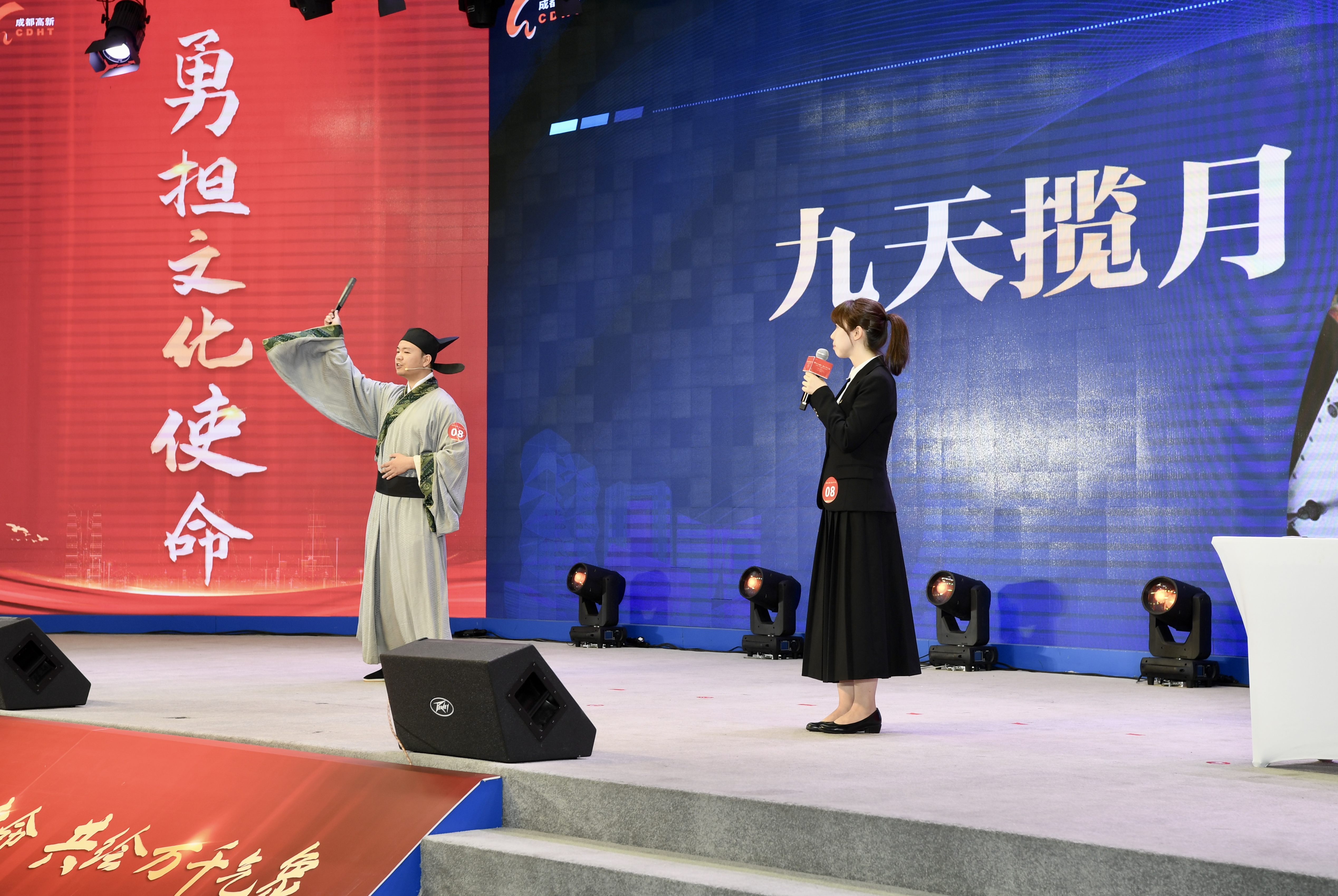 “心安是归处,圆梦在成都。让我们以踏实勤恳之姿埋头苦干,以追风赶月之势奋勇前进,以铿锵有力之声唱响时代,在成都、在高新,共创锦绣未来。”来自成都高新未来科技城发展集团的宣讲组合,以“今月照古人,他乡是故乡”为主题,通过与诗人李白穿越时空的对话,讲述了成都市、成都高新区、成都未来科技城的创新发展。