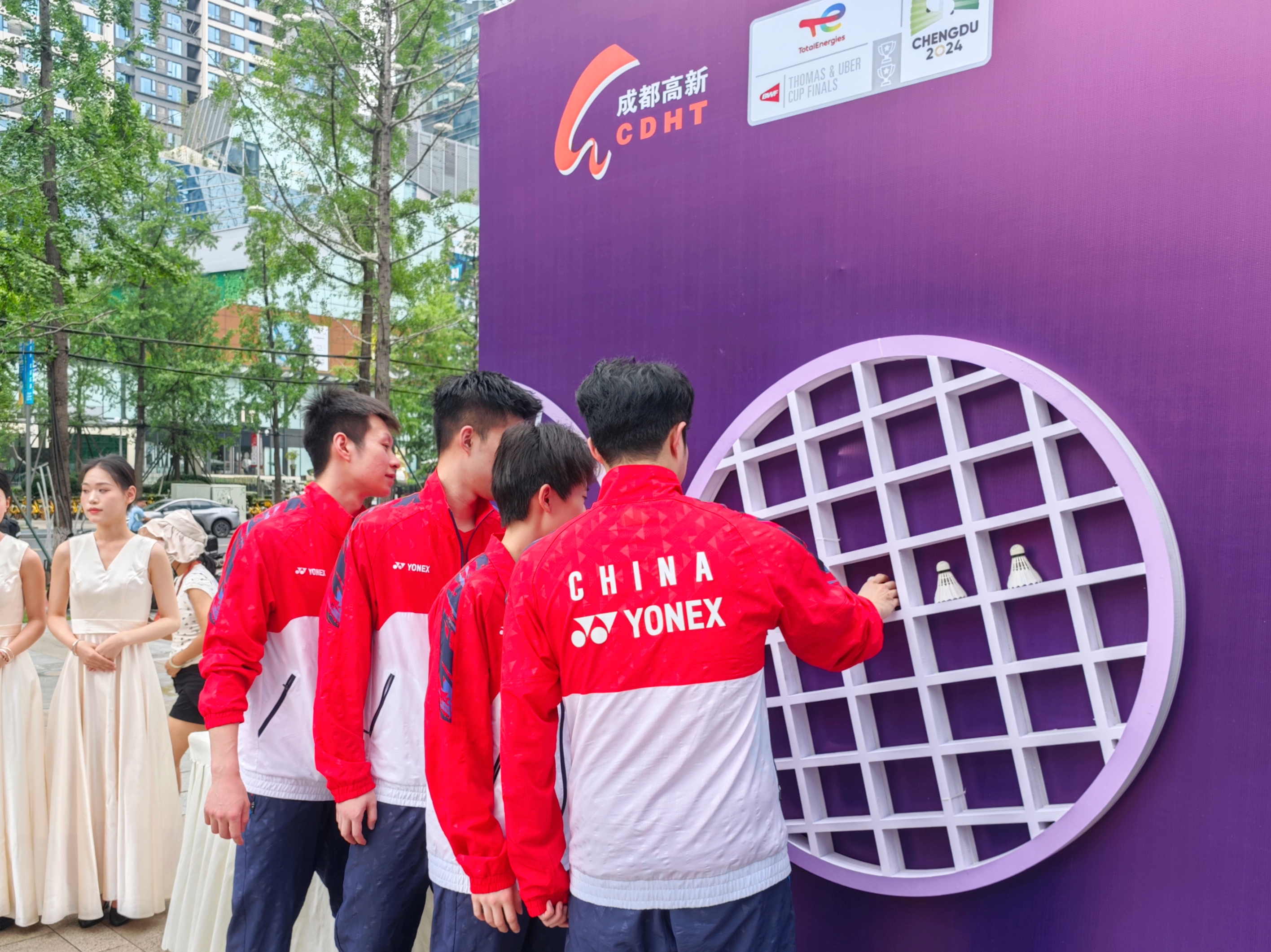 当天下午,国羽冠军翁泓阳、何济霆、任翔宇,陈雨菲、郑雨、张殊贤等一行抵达成都高新区石羊街道锦城社区交子音乐广场。在成都2024汤尤杯文化墙前,工作人员向国羽冠军选手介绍了成都高新区羽毛球系列赛事的超强人气:“每当有羽毛球赛事报名通知发布,市民、学生都积极报名,羽毛球运动日益火热。”成都2024汤尤杯汤尤杯的举办点燃了成都高新区市民的羽毛球运动热情,参与羽毛球运动的市民越来越多。冠军们也不禁为成都高新区群众的运动热情“点赞”。