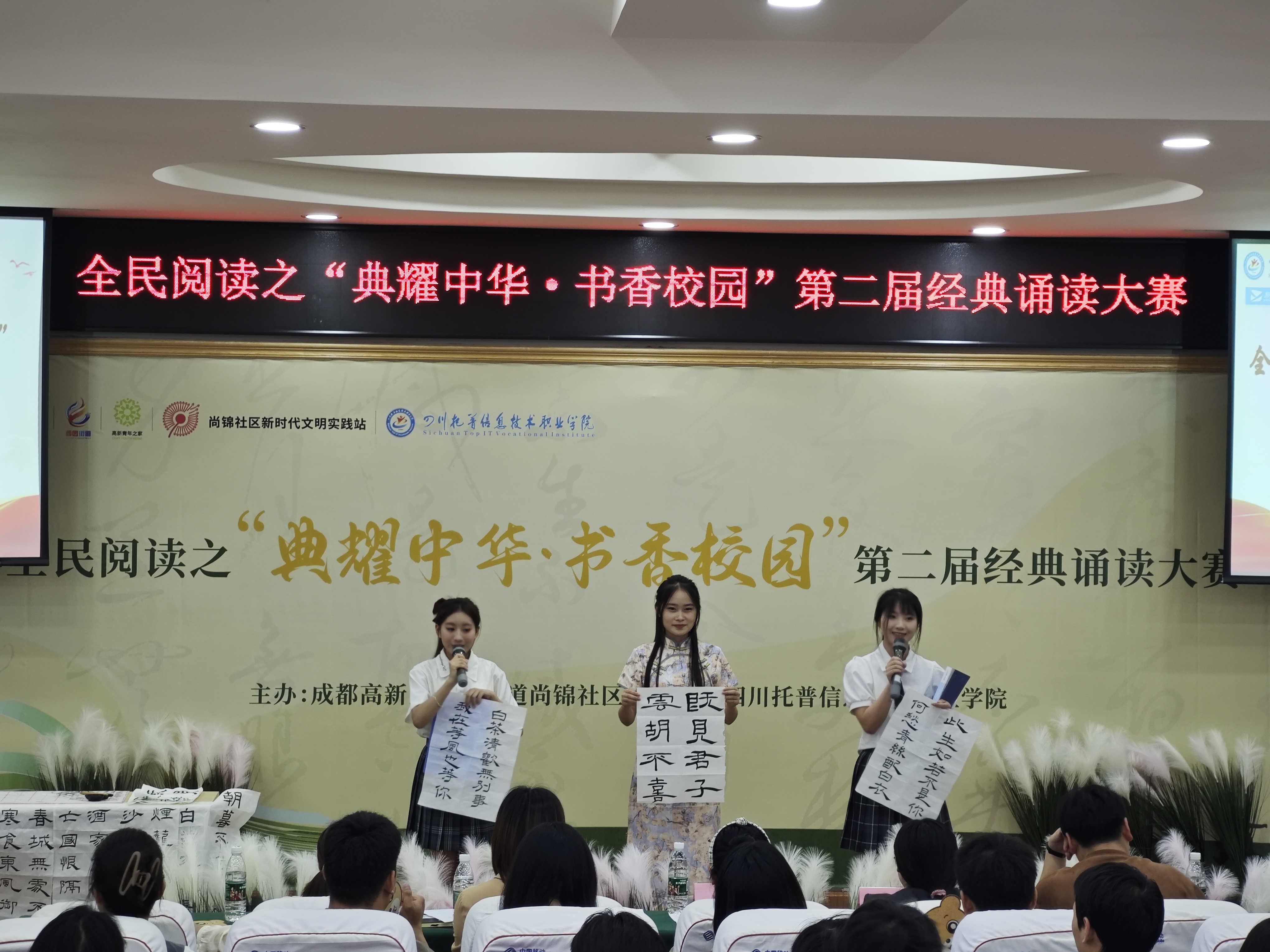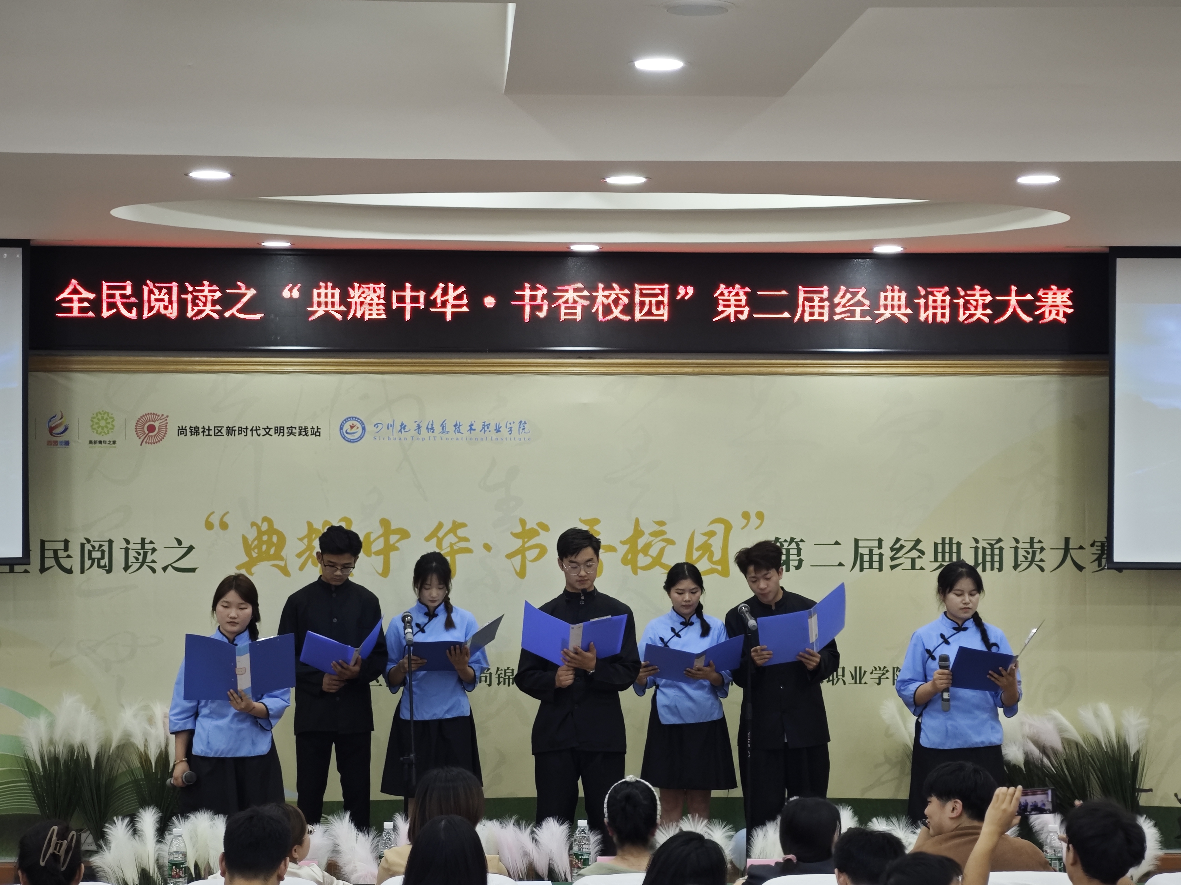雅言传承文明,经典浸润人生。为点燃阅读热情,营造全民阅读的良好氛围,提升辖区高校青年师生及居民的语言文字应用能力和传统文化素养,5月16日,成都高新区西园街道尚锦社区新时代文明实践站联合四川托普信息技术职业学院,开展全民阅读之“典耀中华 书香校园”第二届经典诵读大赛。