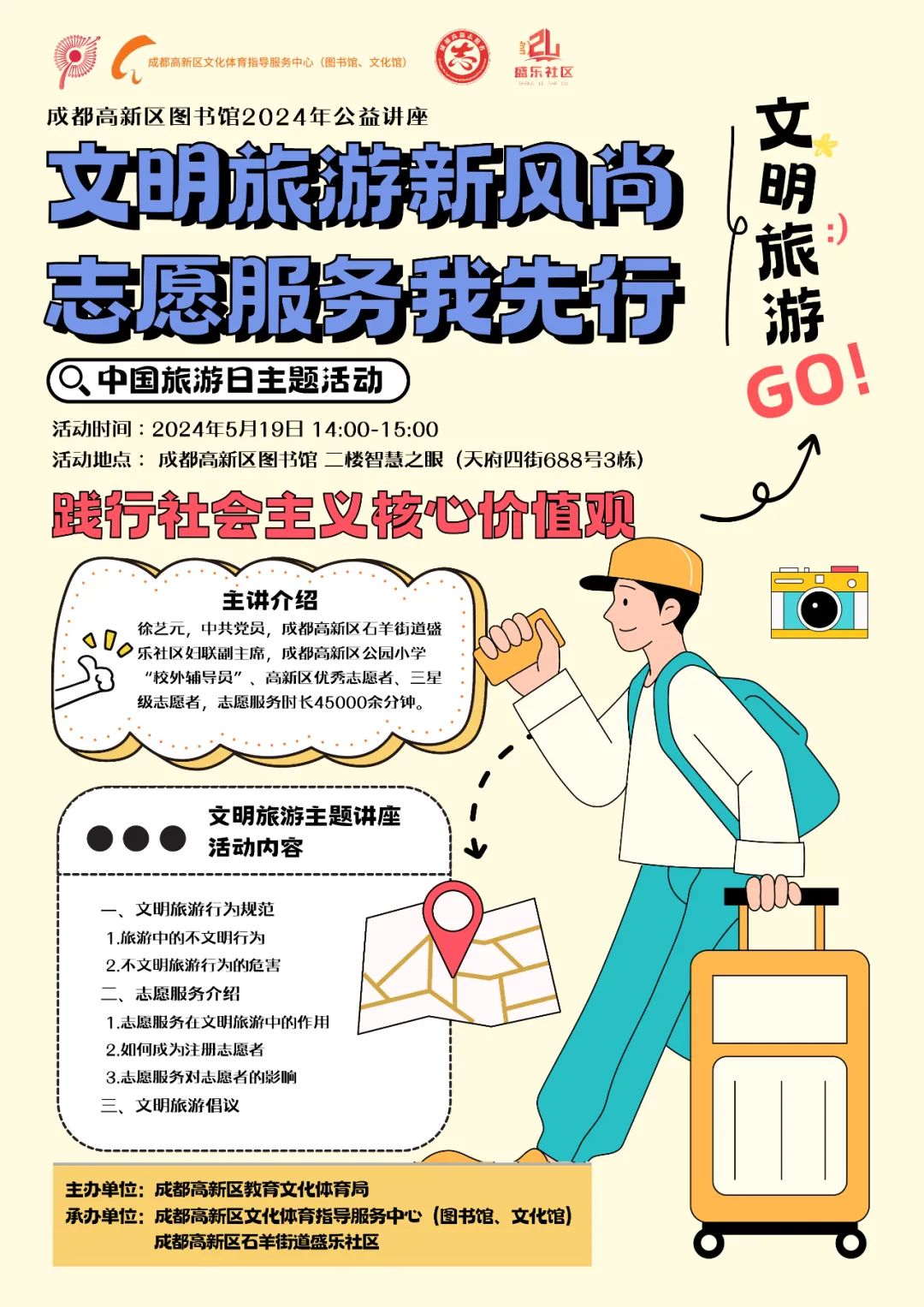为提高民众文明旅游意识与安全意识,展现成都多彩动人的魅力形象,今年中国旅游日将举办“文明旅游新风尚,志愿服务我先行——中国旅游日主题活动”。为读者普及文明旅游知识,介绍文明旅游志愿服务,希望通过本场活动,让美丽成都的城市名片更加精彩。