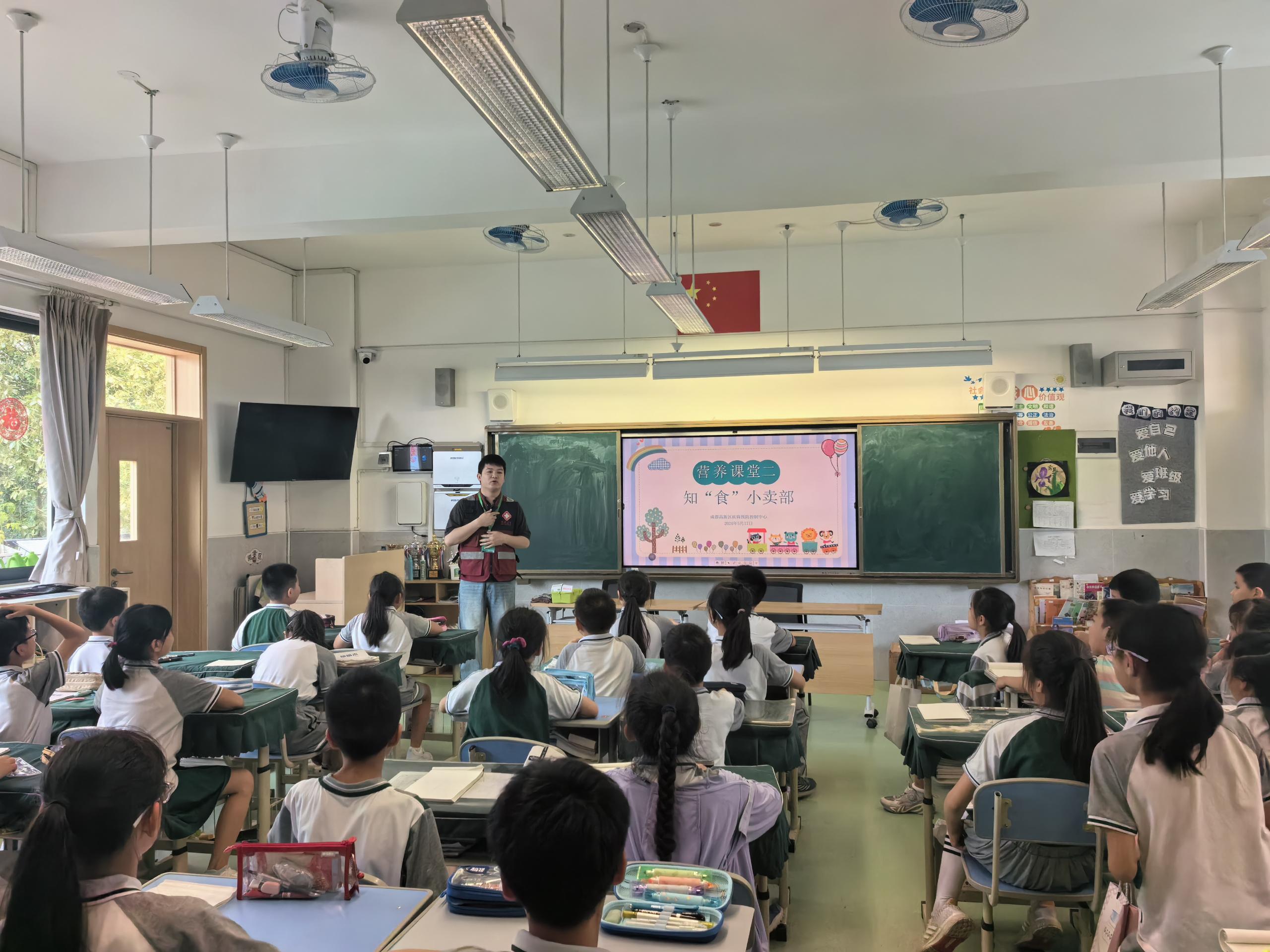 课堂上,成都高新区疾控中心工作人员向同学们介绍了预包装食品上的食品标签和营养标签,详细讲解了如何通过营养成分表计算预包装食品的营养素含量和营养素参考值百分比等知识,并播放原创动画《读营养成分表,做健康小达人》来加深同学们的理解。