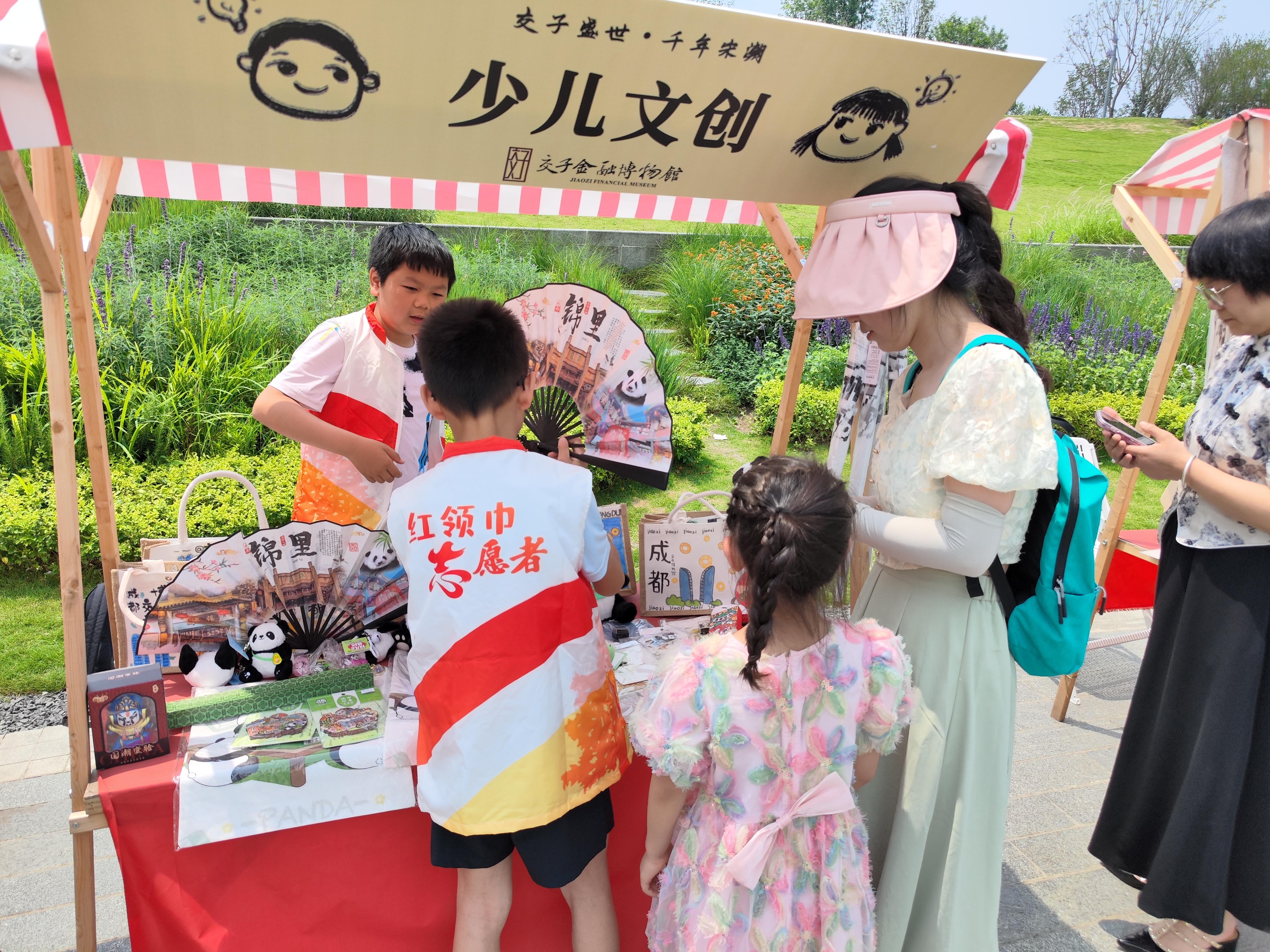 “哥哥姐姐,看一看我们的文创扇子。”“叔叔阿姨,这个是我们自己在背包上画的图案,很漂亮的。”刚走进游园会活动区域,就听到身穿红白橘颜色相间马甲的小朋友在大方吆喝。走近一看,名为“少儿文创”的摊位上摆着颇具成都色彩的文创产品。钥匙扣、手链、胸针、背包、扇子、挂件……琳琅满目。