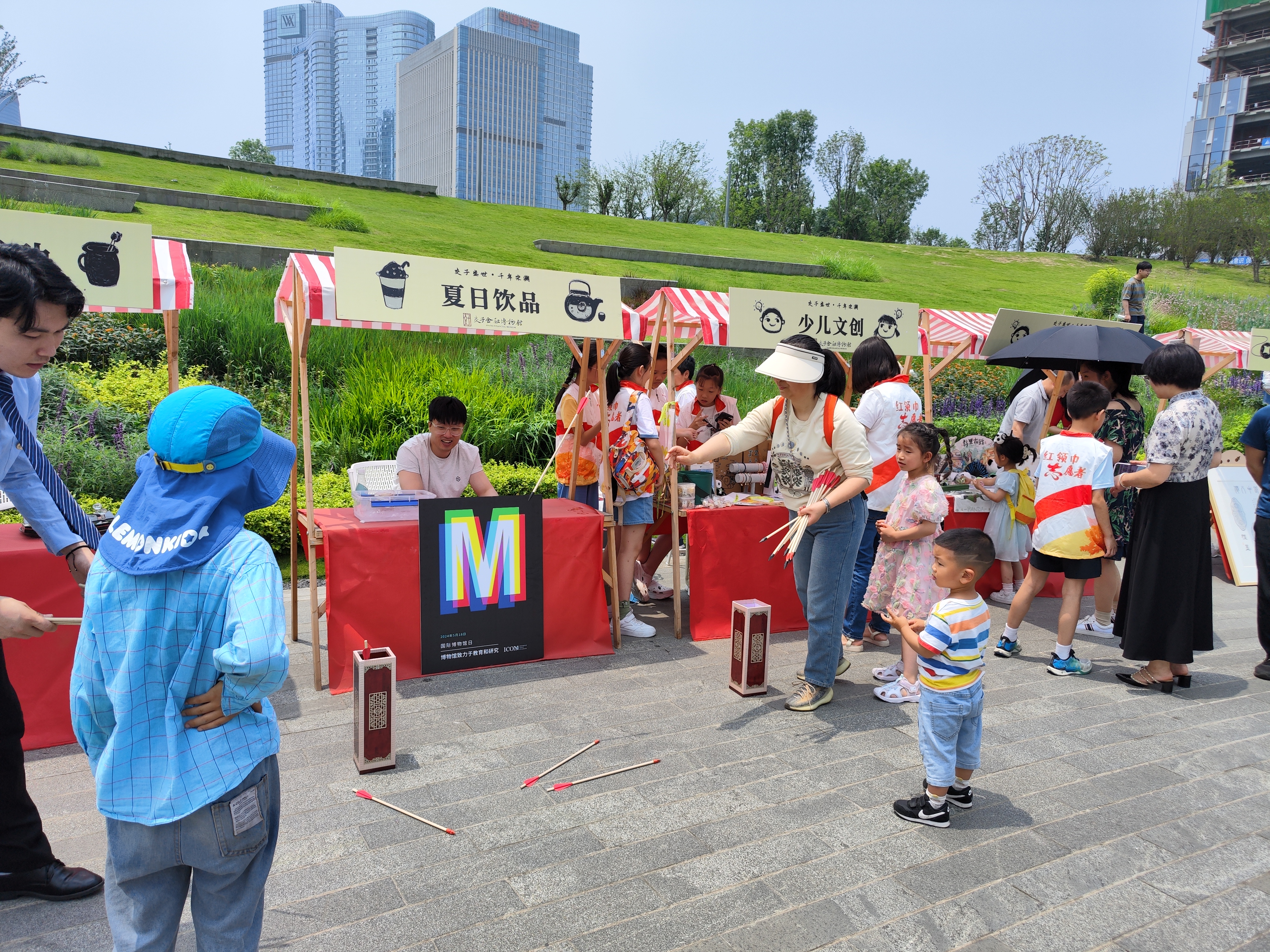 此外,游园会中还有宋“潮”运动、交子文创两个摊位。在宋代运动体验区,参与者可体验宋代投壶游戏的乐趣,5次投掷箭矢都投中即可获取一份饮品。在交子文创区域,也在展示并销售交子金融博物馆的文化创意产品。交子不仅在宋代经济中扮演了重要角色,同时也反映了我国深厚的金融文化。文创产品不仅具有艺术性和实用性,更是交子文化传承和发展的一种体现。