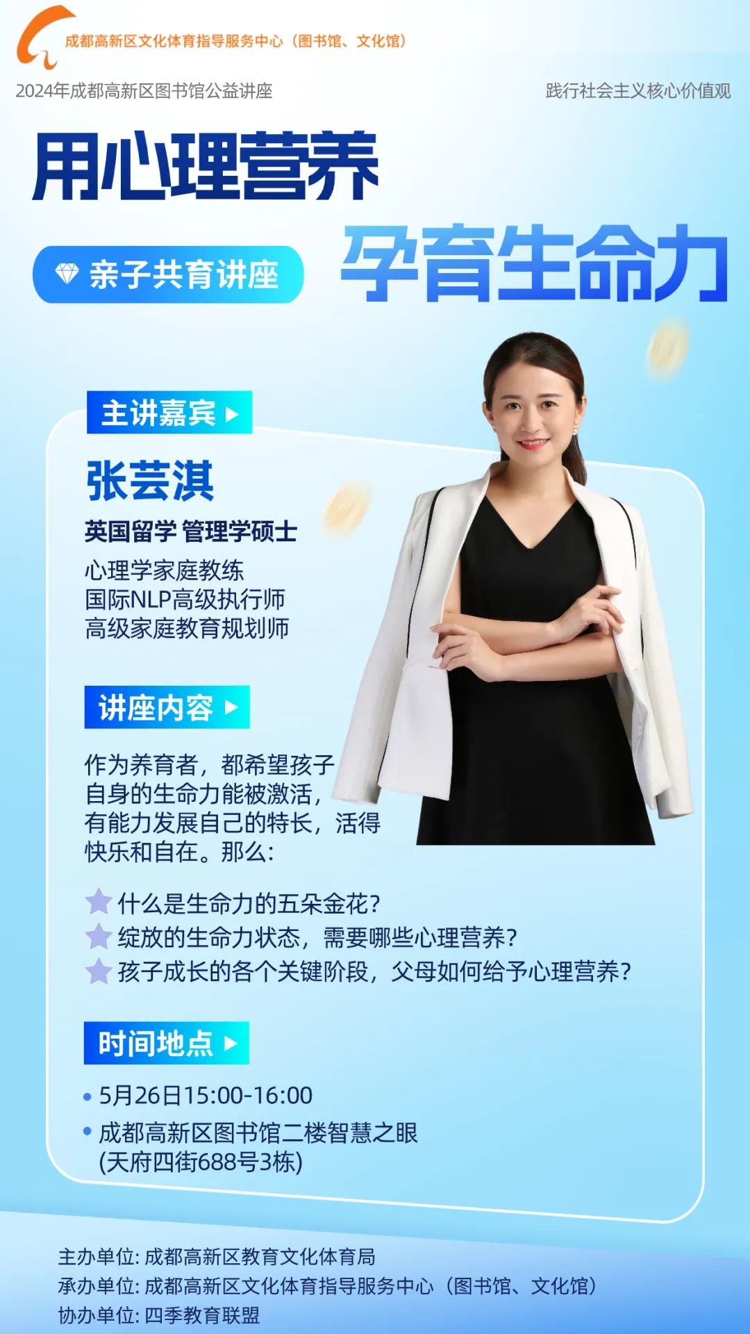 当父母亲把养育孩子的理念,用来对待自己、学习做自己的父母时,他们的生命、相互关系及生活品质,也会随之发生改变。本场讲座活动将通过游戏互动、案例拆解,让走进课堂的父母亲可以了解生命的五朵金花、心理营养的重要性,以及学习如何在育儿过程中进行应用。