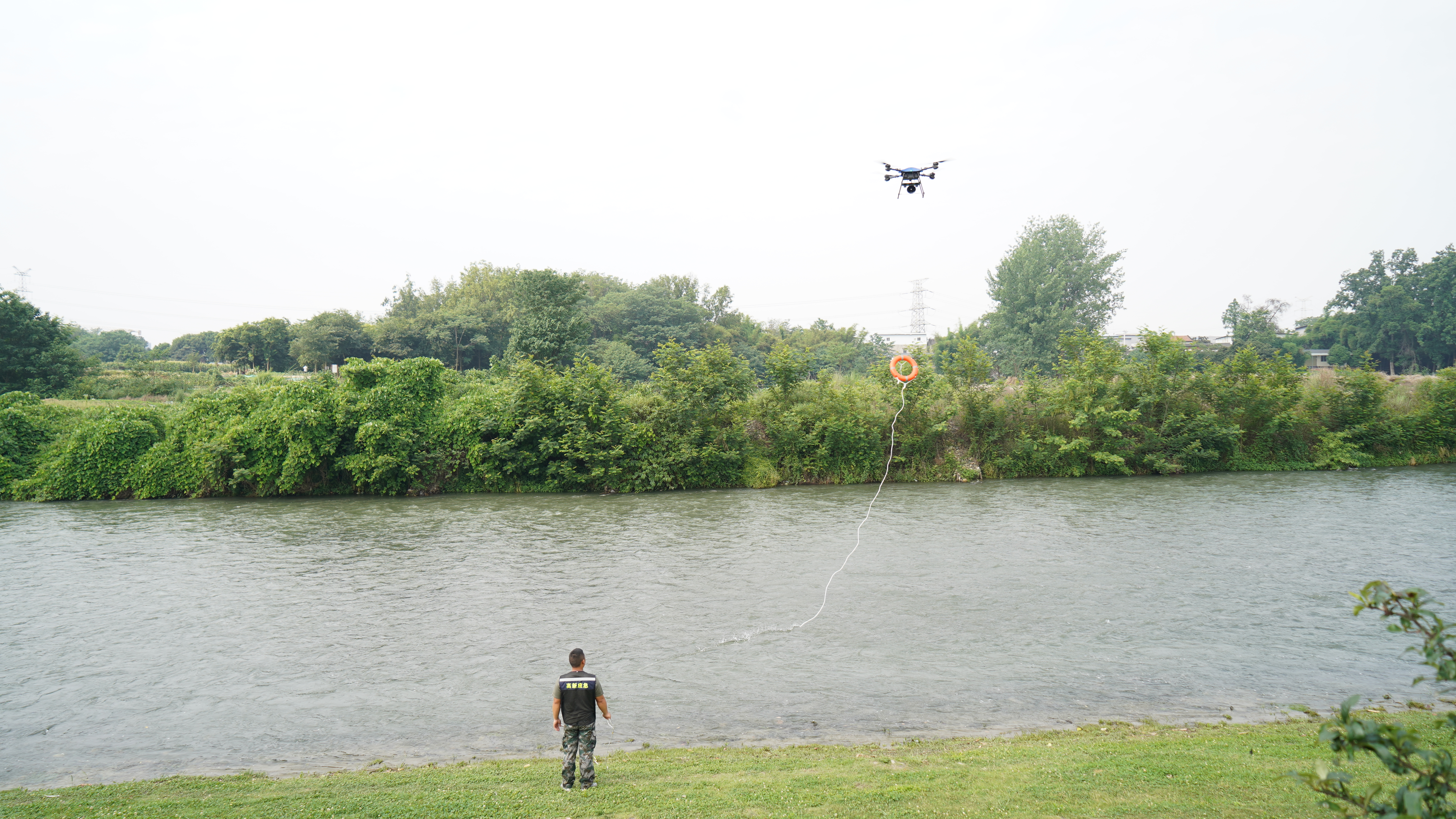随着演练的有序展开,天空传来一阵机翼转动的声音,无人机从头顶飞过,系着救生圈飞向“落水群众”点位,精准投递,并通过现场实时传输画面,为指挥人员提供准确信息,以科技助力防汛抢险工作。“无人机可以执行巡查、照明、空中抛掷等任务,特别是在救援人员无法靠近的救援点发挥了重要作用。”演练相关负责人介绍。