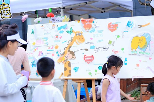 台上表演精彩纷呈,台下的工作坊同来迎来居民们的积极体验。尽管天气炎热,也抵挡不住居民们的参与热情。此次活动共设置了七个街道搭建的心情空间趣味工作坊,包括“夏天的约定”“扭到你心里”“快乐小狗,带我走吧”“青年人撒欢营地”“蕉绿卸载站”“给自己一个爱的抱抱”“心晴刮刮乐”,通过趣味游戏的方式让不同年龄的居民释放压力,放松身心。