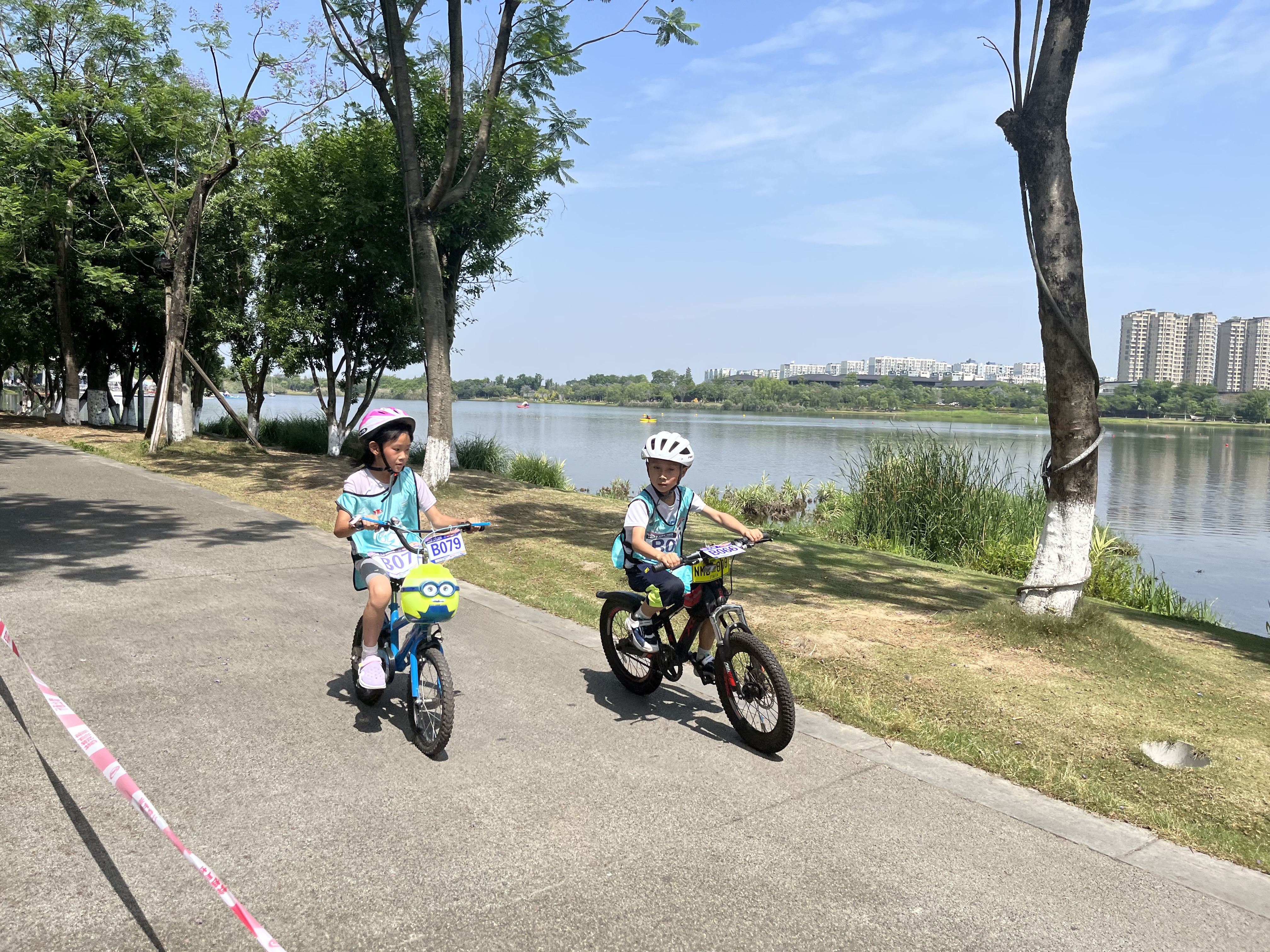 完成了“漂流”,小铁人们迅速赶到骑行赛段,他们跨上自行车,迎着掌声,奋力向前;完成骑行后,他们又踏上了奔跑的赛道上,你追我赶,展现体育“更高、更快、更强”的精神,尽管筋疲力尽依然拼尽全力冲向终点……在艰难的赛程中,他们灵活应对各种挑战,时而加速冲刺,时而稳定巡航,展现出了出色的骑行技巧和体能。