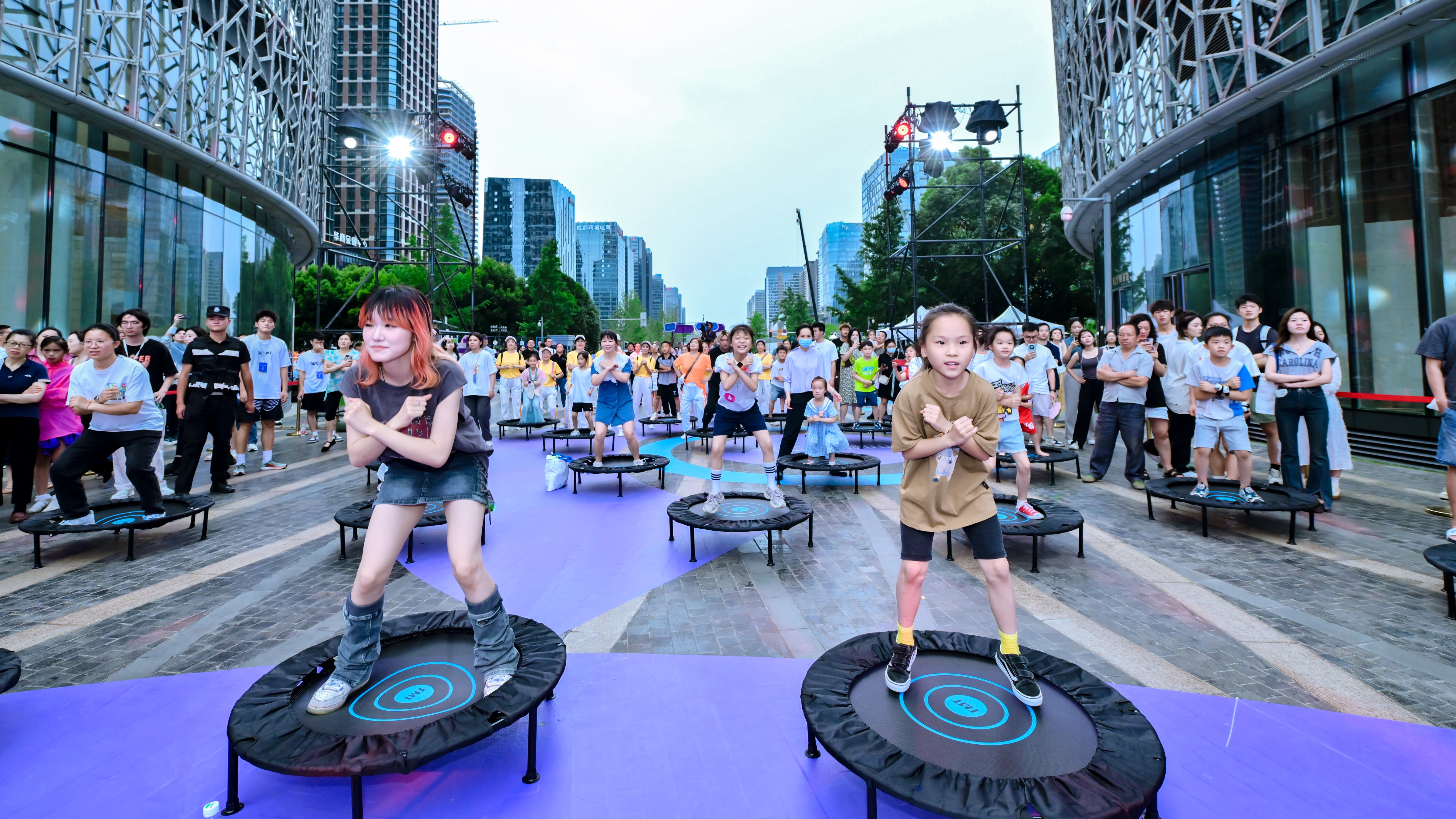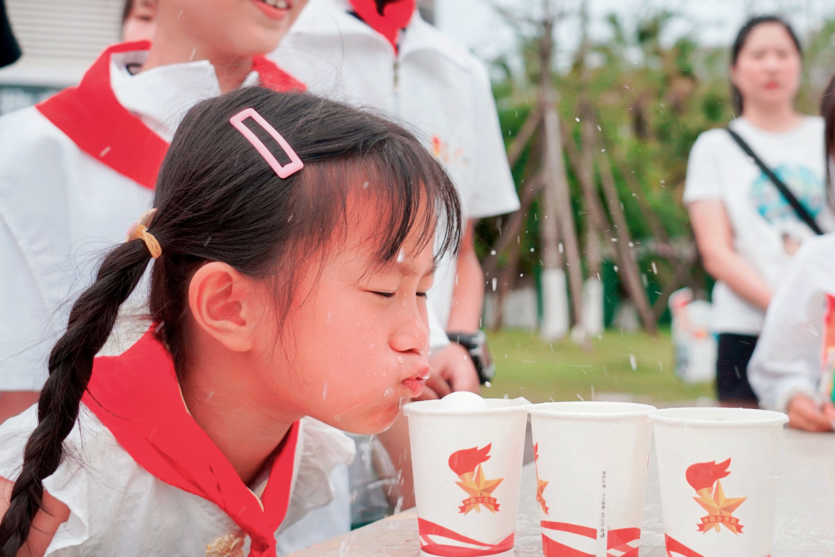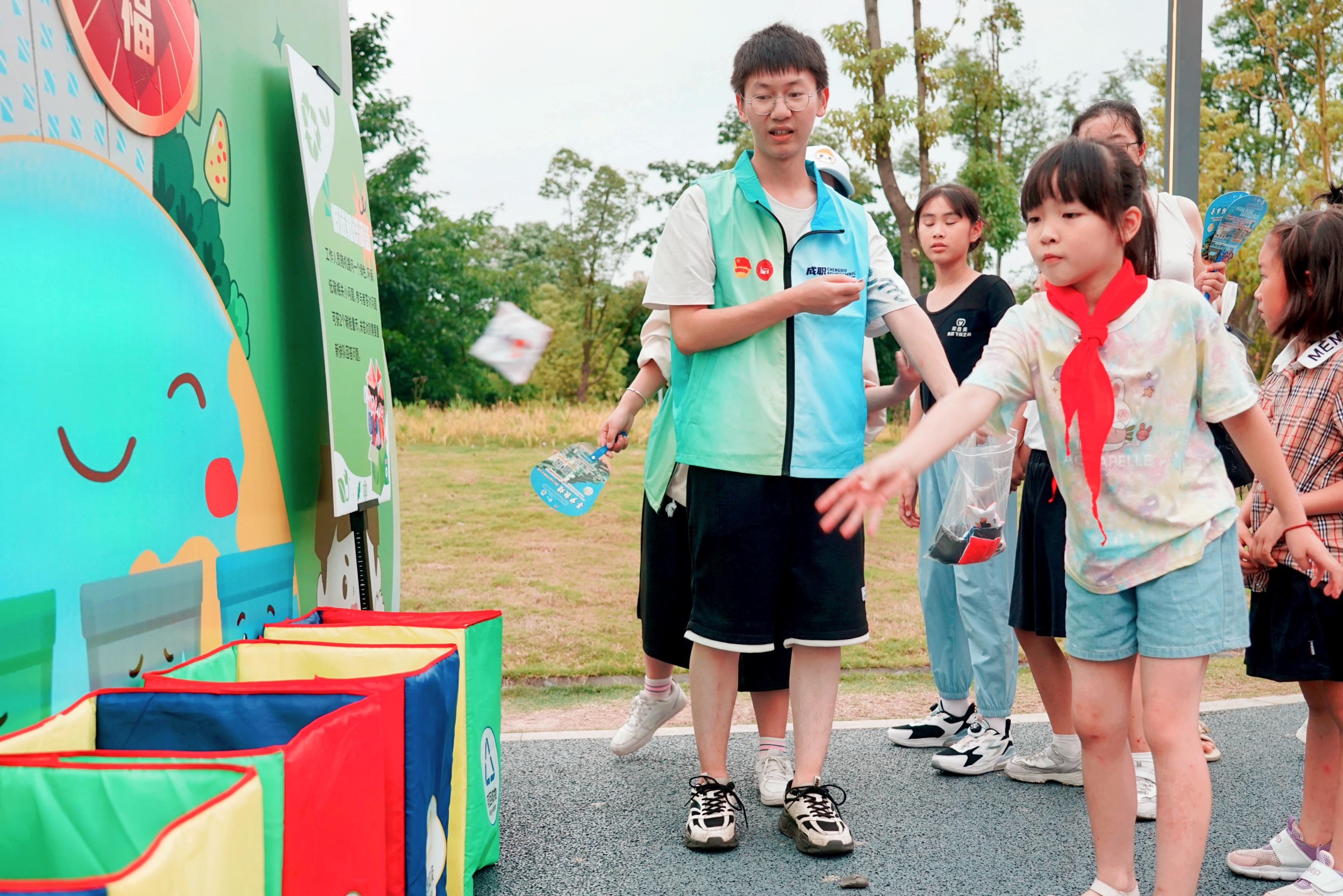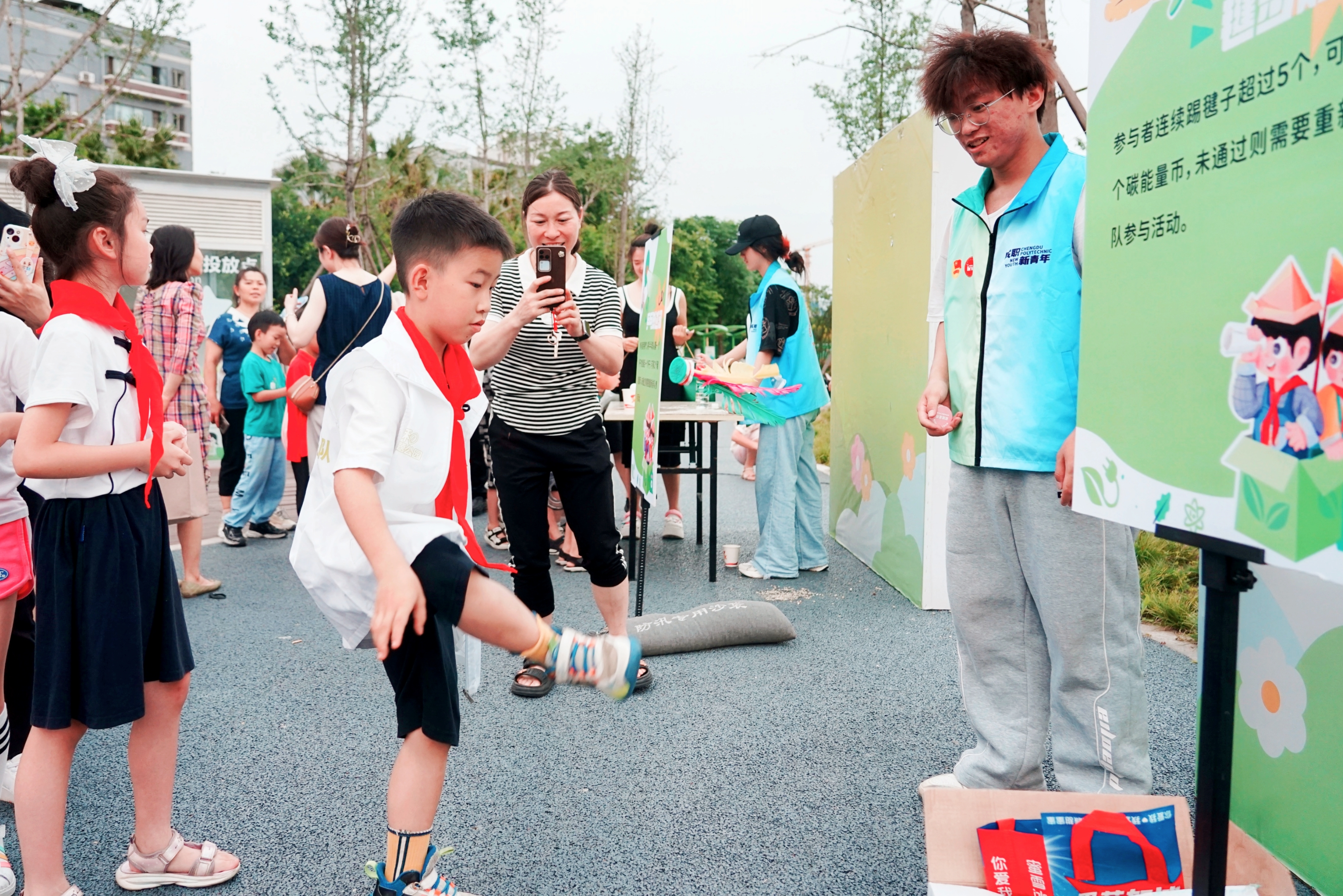 除了集市购物,现场还设置了垃圾分类知识问答、百米画卷绘国旗、踢毽子等一系列富有创意和趣味性的体验活动,吸引队员们参与闯关游戏,获得“碳能量币”。小队员们都铆足了劲儿,认真努力地完成闯关活动,现场欢声笑语不断。
