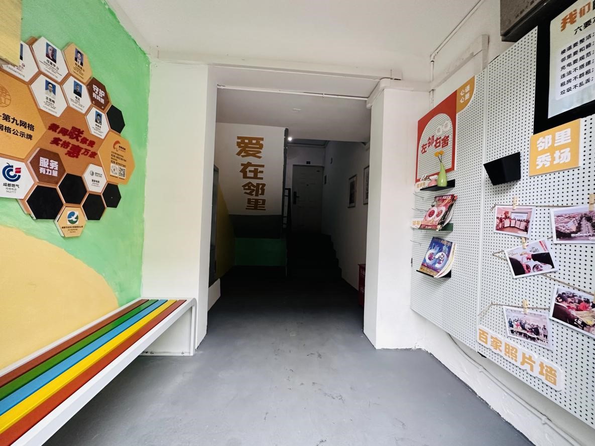 经过一段时间的打造,楼道的自行车、废纸板和淘汰家具不见了,墙面半脱落的墙皮、黑脚印、广告纸张移除或清理了,家门口安全清爽整洁;弱电箱、消防箱和墙面穿上了漂亮的“新衣”;居民们在焕然一新的门厅座椅上休憩聊天,驻足洞洞板感受邻里情谊……