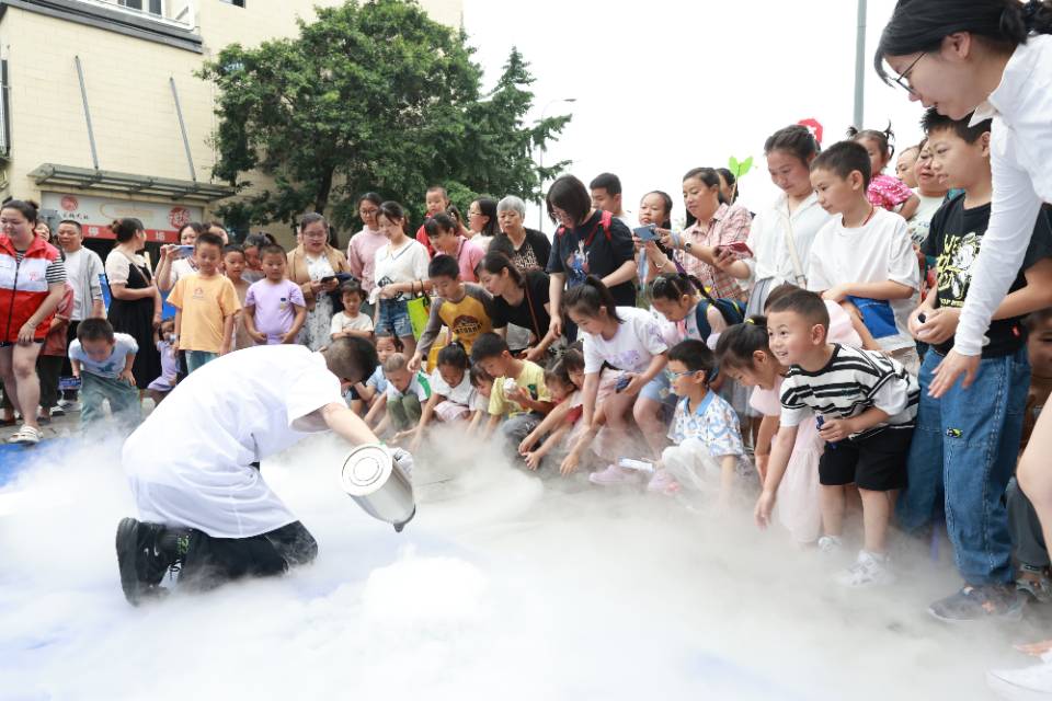 除了精彩的表演,现场还设置了多个科学小实验体验区。在这些区域里,孩子们可以亲手参与各种有趣的科学实验,如奇幻液氮实验秀、干冰火焰手掌实验秀、空气炮实验秀、电力小实验等。现场的工作人员耐心地解答着孩子们的疑问,引导他们亲手操作,让他们在实践中感受到科学的魅力。