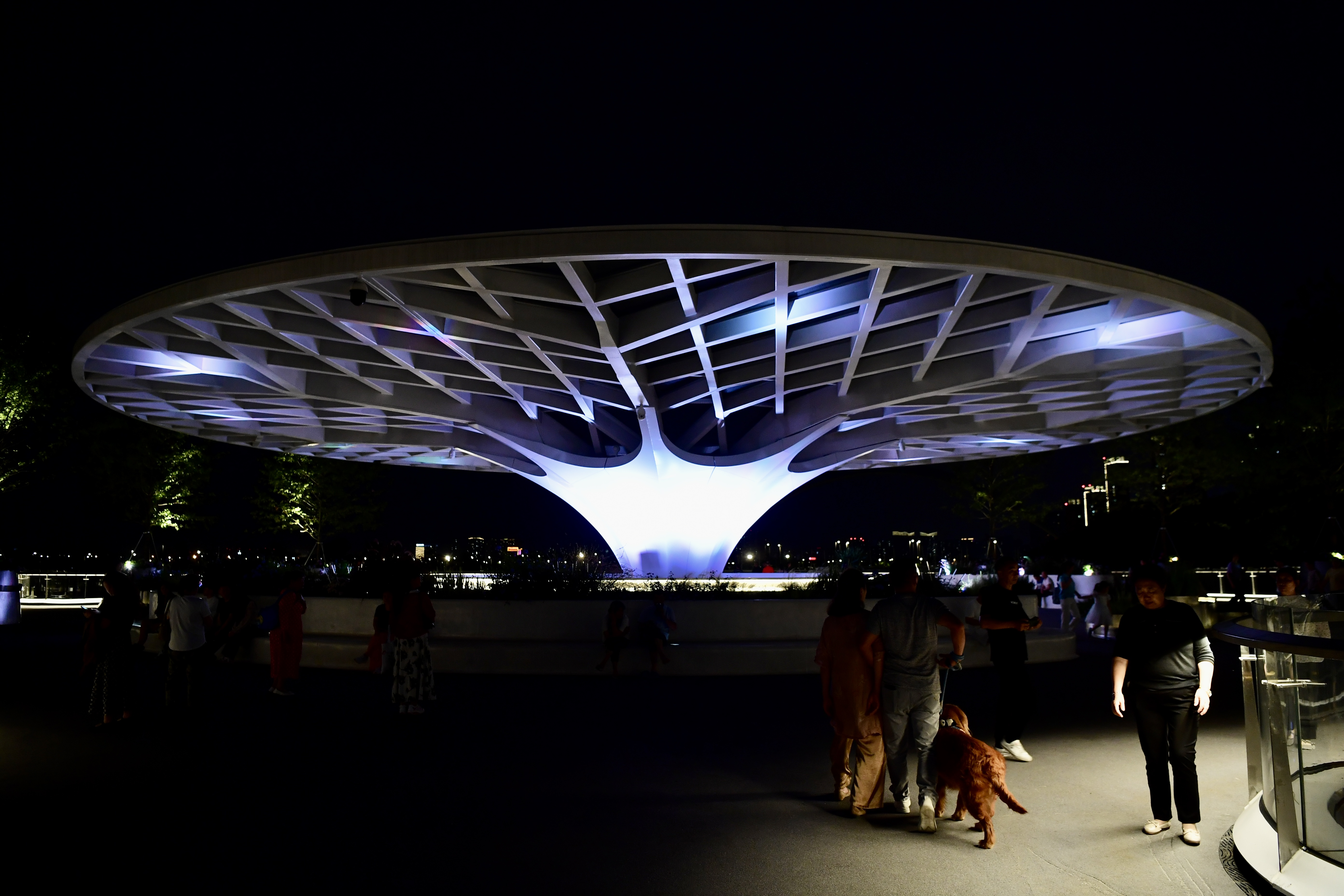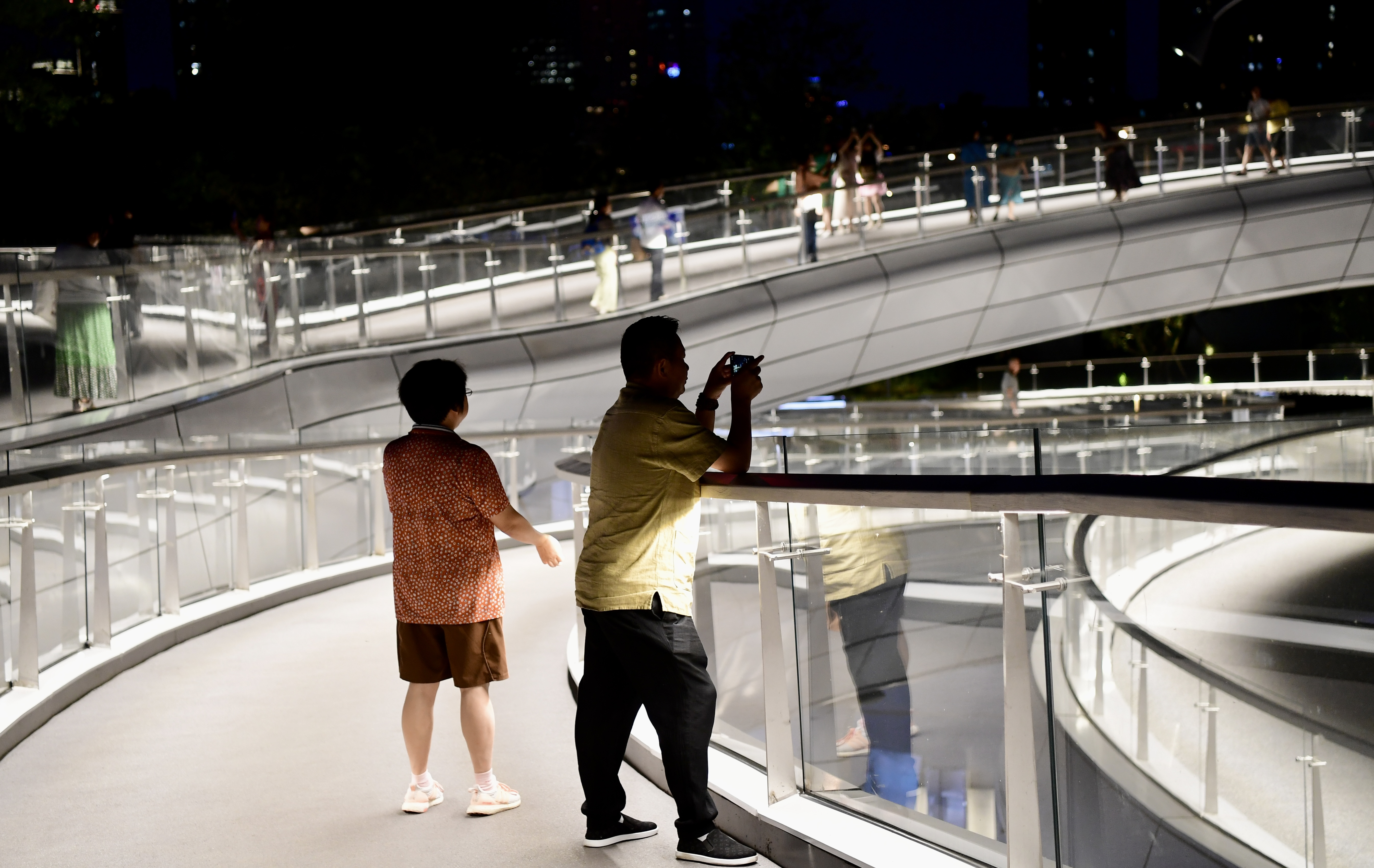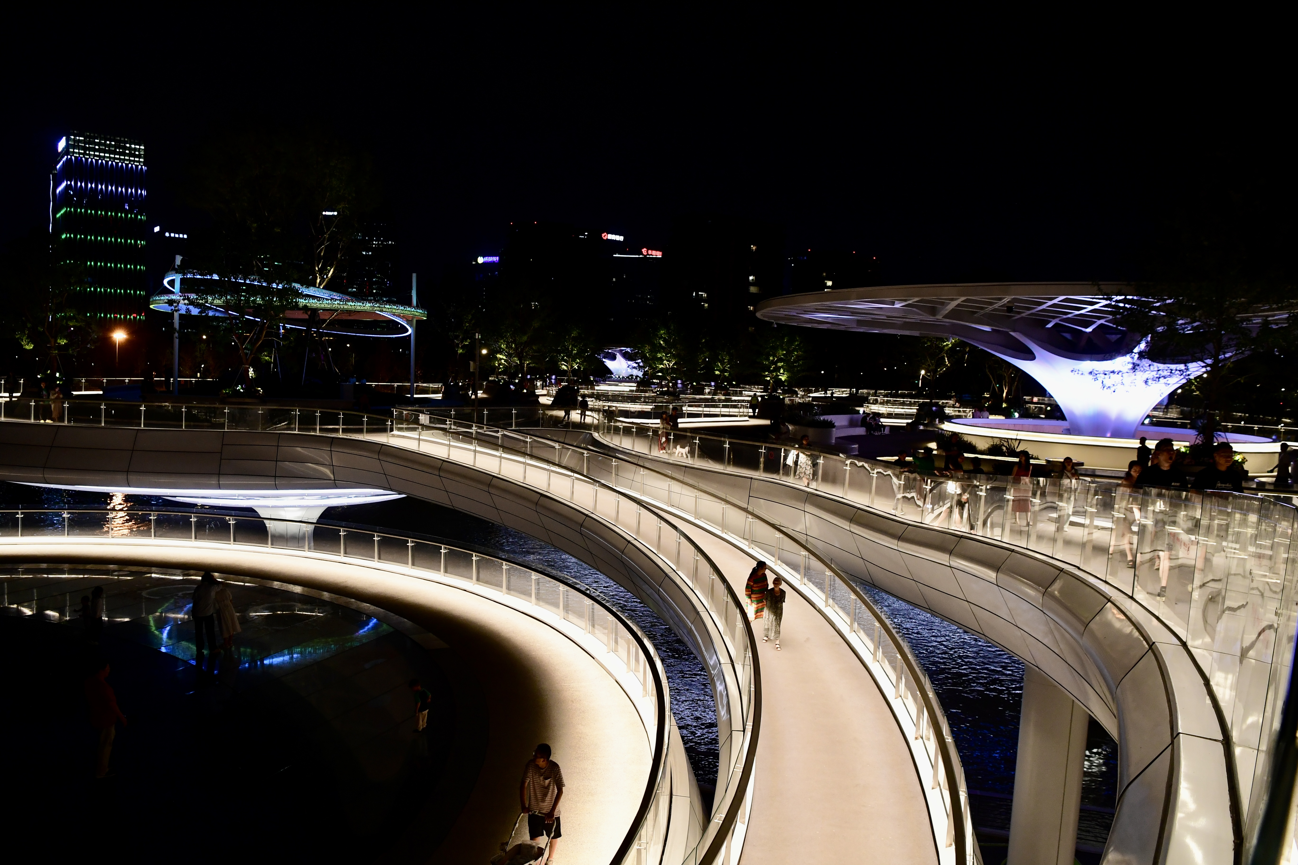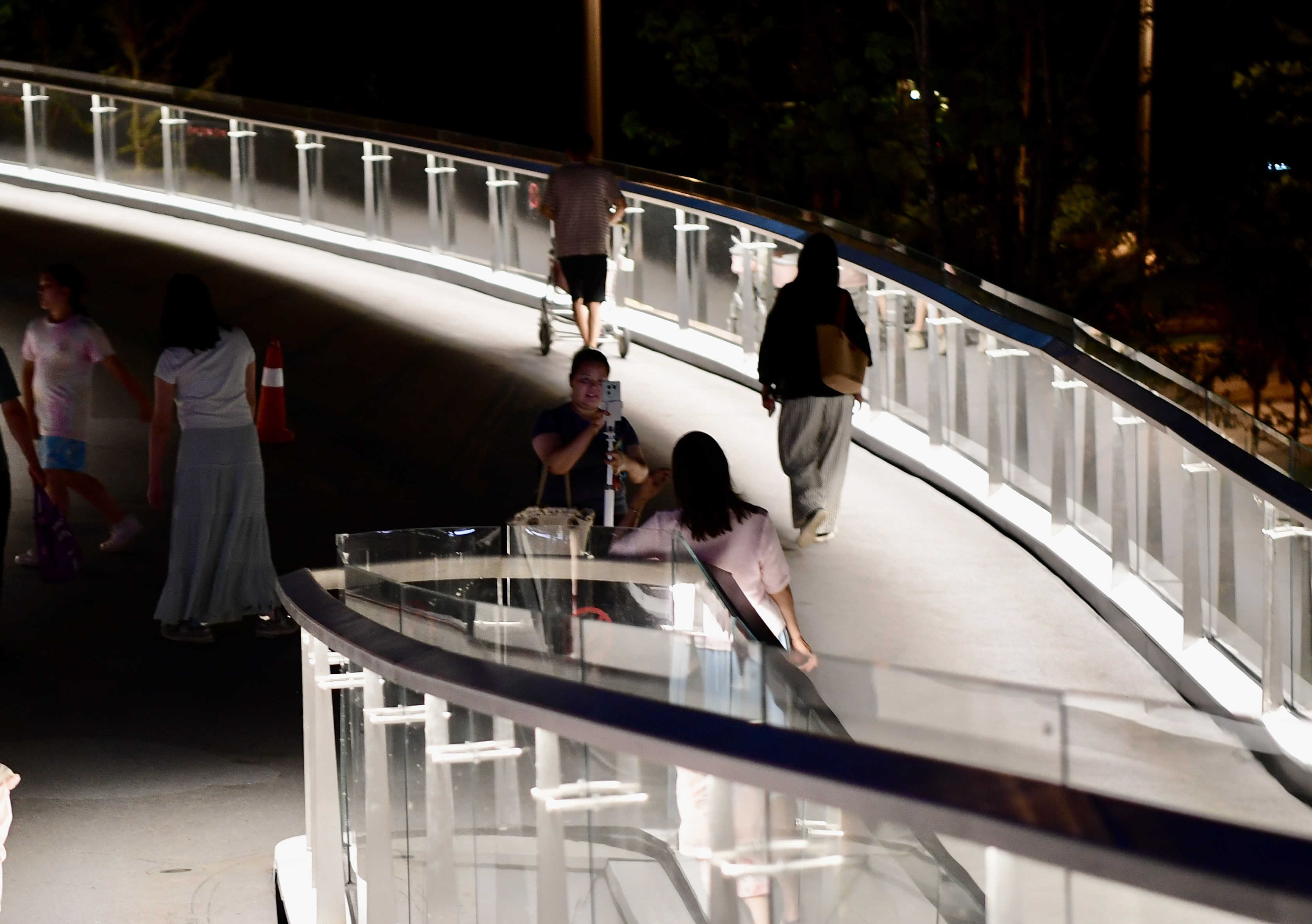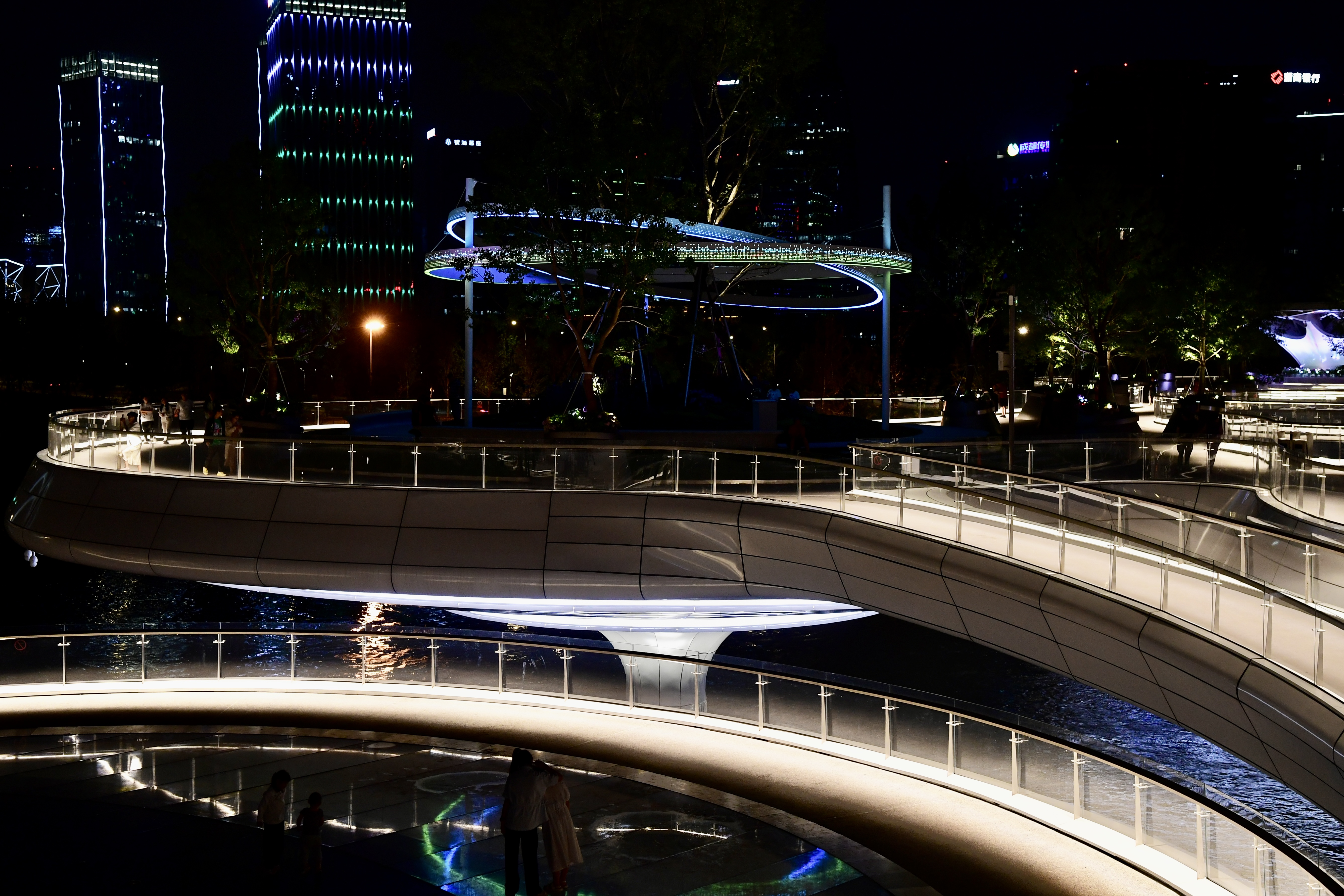 6月5日晚,记者在紧临锦江绿道的交子人行桥看到,明亮的灯光勾勒出桥体的线条,炫酷的光影营造出一片浪漫的夜色。在夜晚的朦胧中,远远望去,这座桥宛如一道流光照亮了夜空。桥上那莲叶状的装置在灯光的映照下闪闪发光,仿佛是夜晚的精灵在跳动,为这座桥增添了一份神秘而浪漫的气息。