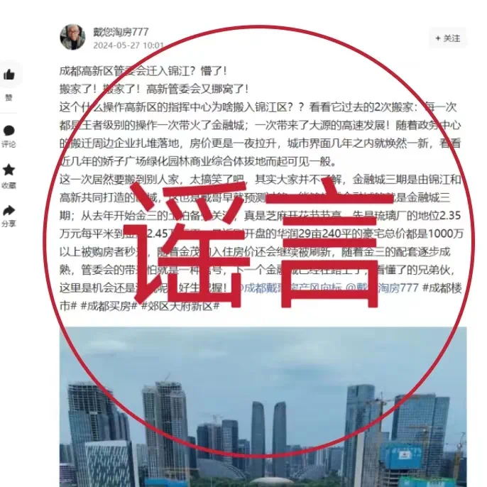 5月27日,网民戴某发布一篇标题为“成都高新区管委会迁入锦江”的相关帖文,内容描述为成都高新区管委会迁入锦江区。目前帖文已删除,经核实,该帖文系谣言。成都高新公安石羊派出所在网安大队牵头下,对发布者戴某开展问询调查,经查,戴某为涨粉引流,主观恶意杜撰了该虚假消息帖文。5月29日,戴某因虚构事实扰乱公共秩序已被成都高新公安依法处以行政处罚。