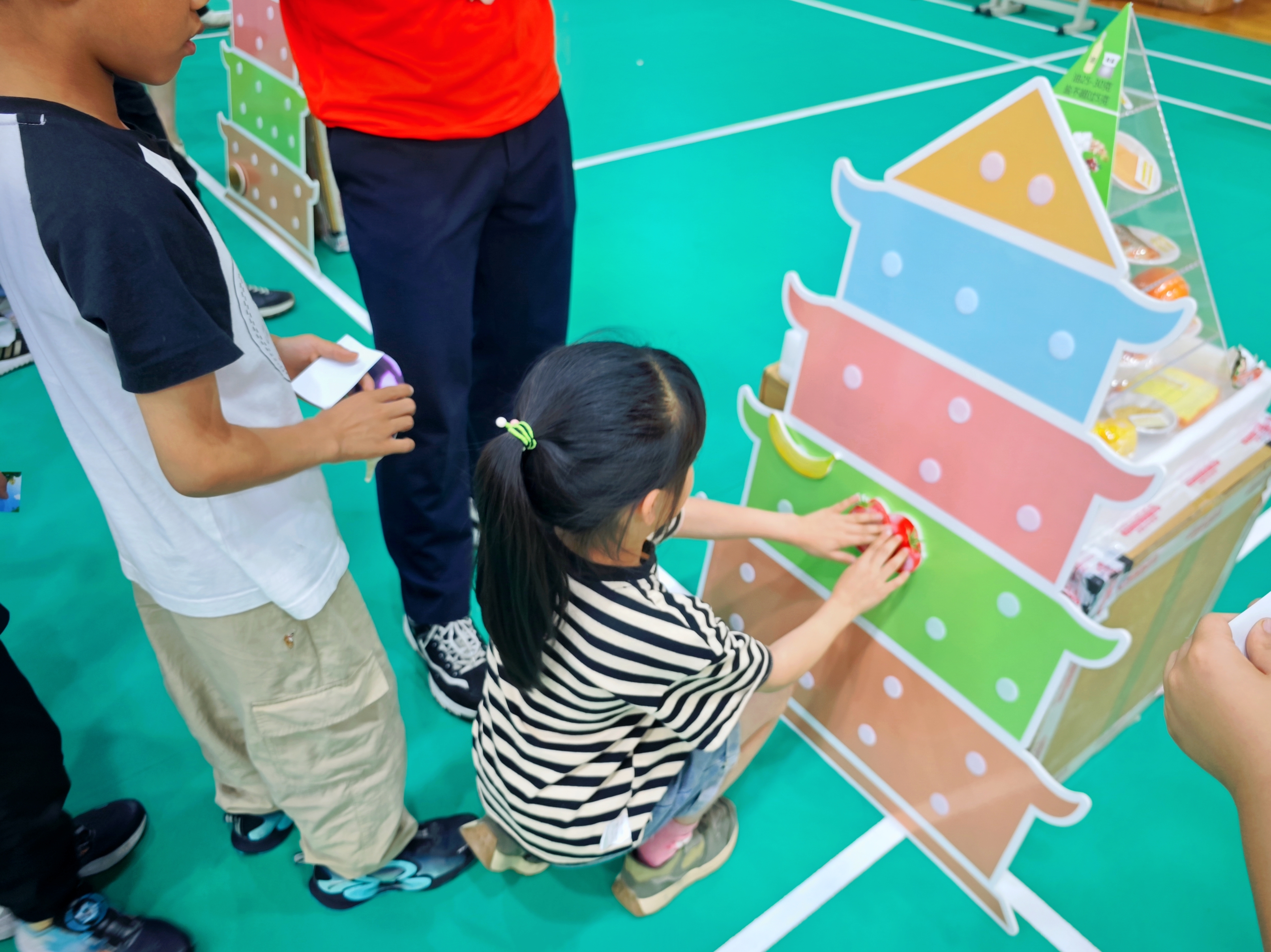 在学校篮球馆内,通过“户外运动体验馆”,学生以颠乒乓球的形式进行比赛,既锻炼了眼睛活力,又达到了增加体育活动的目的;“规律睡眠科普馆”邀请同学们参与有奖问答,了解规律睡眠的重要性,也加深了孩子们对“健康睡眠是维持人体健康的重要行为之一”这句话的理解;最后,同学们一起来到“健康饮食生活馆”,按照从视频里学到的知识和自己的理解,将各种各样的食物放置到中国居民膳食宝塔里。一系列的游戏从运动、睡眠、饮食三个角度出发,帮助同学们在轻松欢乐的氛围中更熟练地掌握课堂中的知识,寓教于乐。
