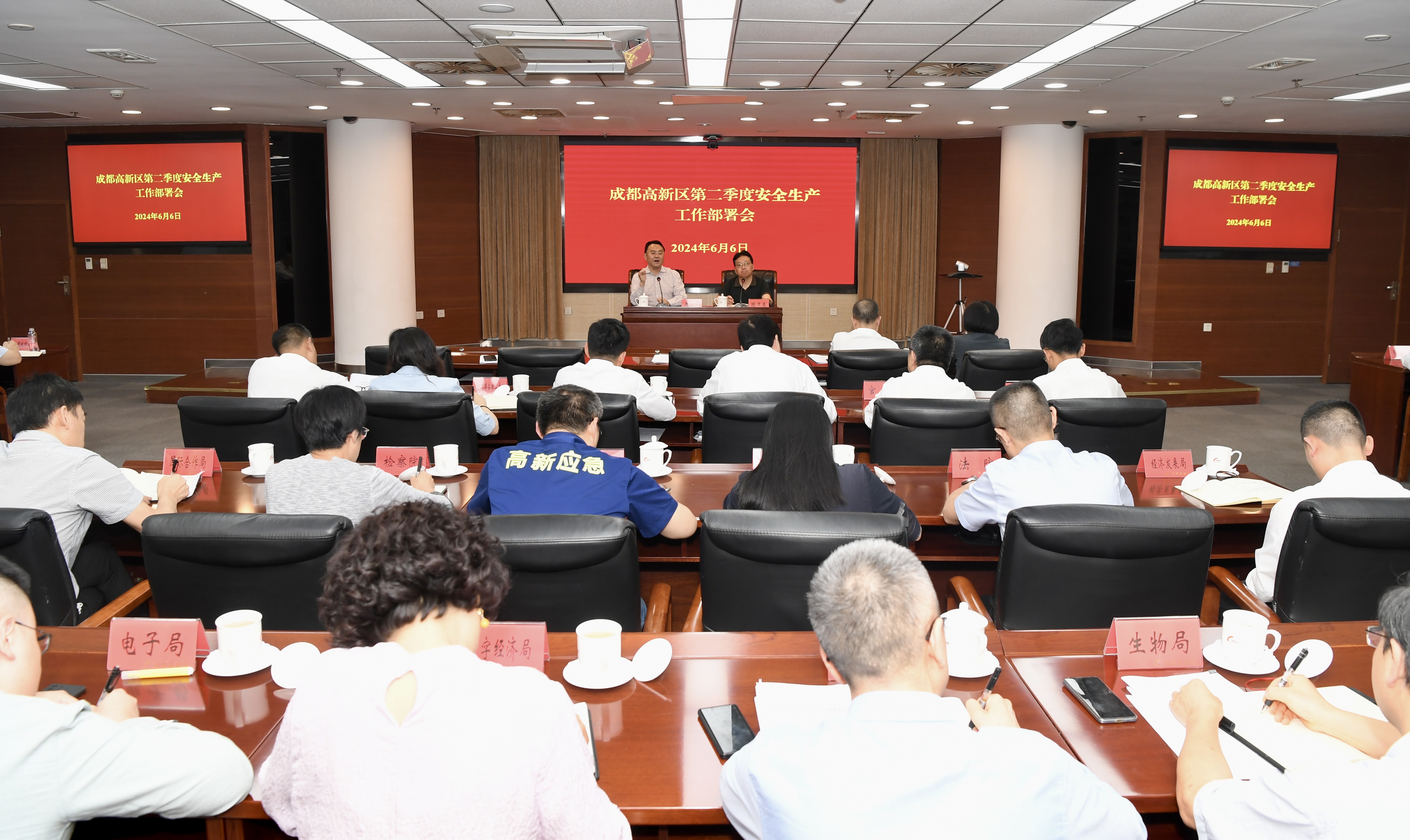 6月6日,成都高新区第二季度安全生产工作部署会召开。成都高新区党工委副书记、管委会主任赵文峤出席会议并讲话。他强调,要深入贯彻习近平总书记关于安全生产的重要论述和重要指示精神,认真落实党中央国务院决策部署和省安委会2024年第二次全体成员会议暨全省第二季度安全生产工作电视电话会议安排部署,深刻汲取近期事故教训,抓实工作压实责任,坚决守牢安全底线。成都高新区党工委副书记、政法委书记陈卫东主持会议。