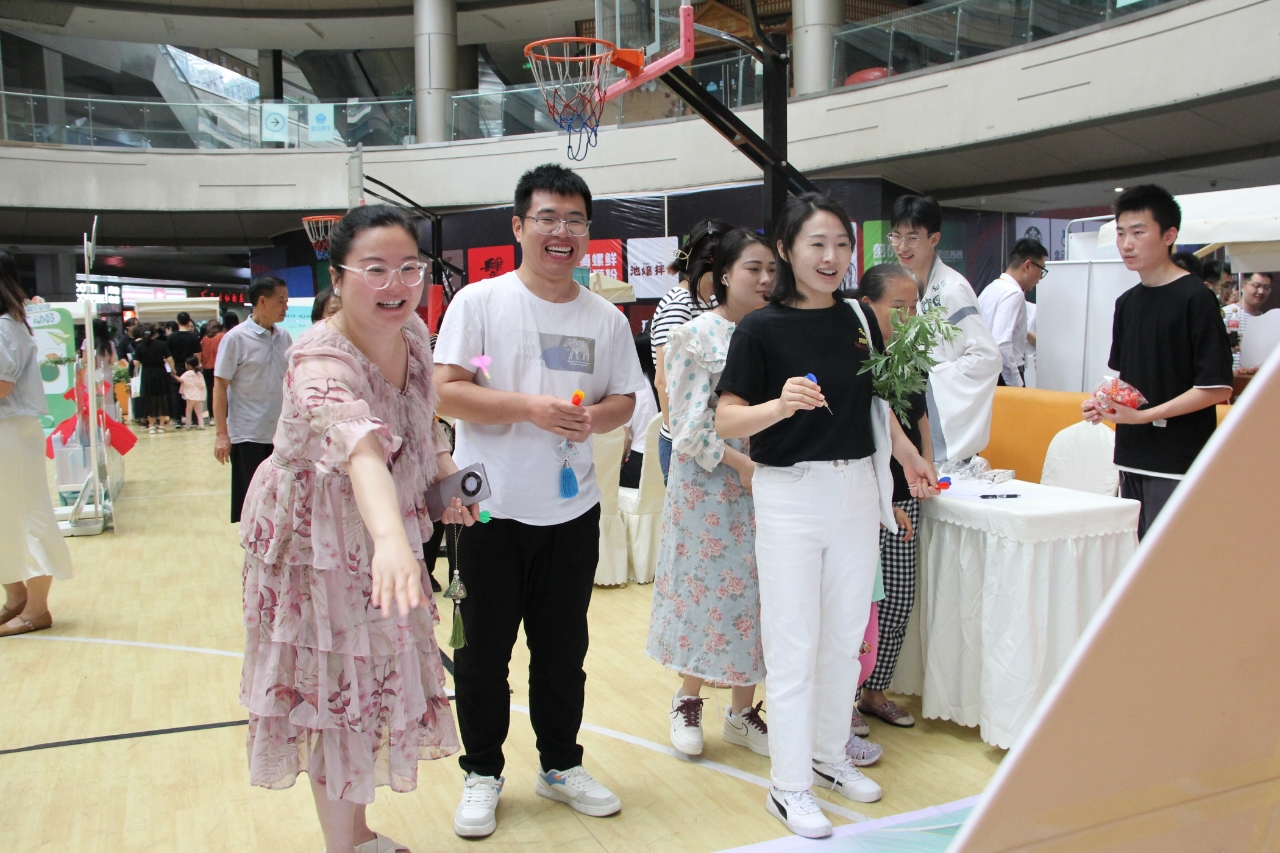 除了穿越古今的汉服打卡,游戏环节也同步开展。钓粽子、射五毒、一箭粽情、“圈”住你、写龙字、手工DIY……“游园集福”的趣味参与方式让现场的居民和职工大呼过瘾,玩得不亦乐乎。