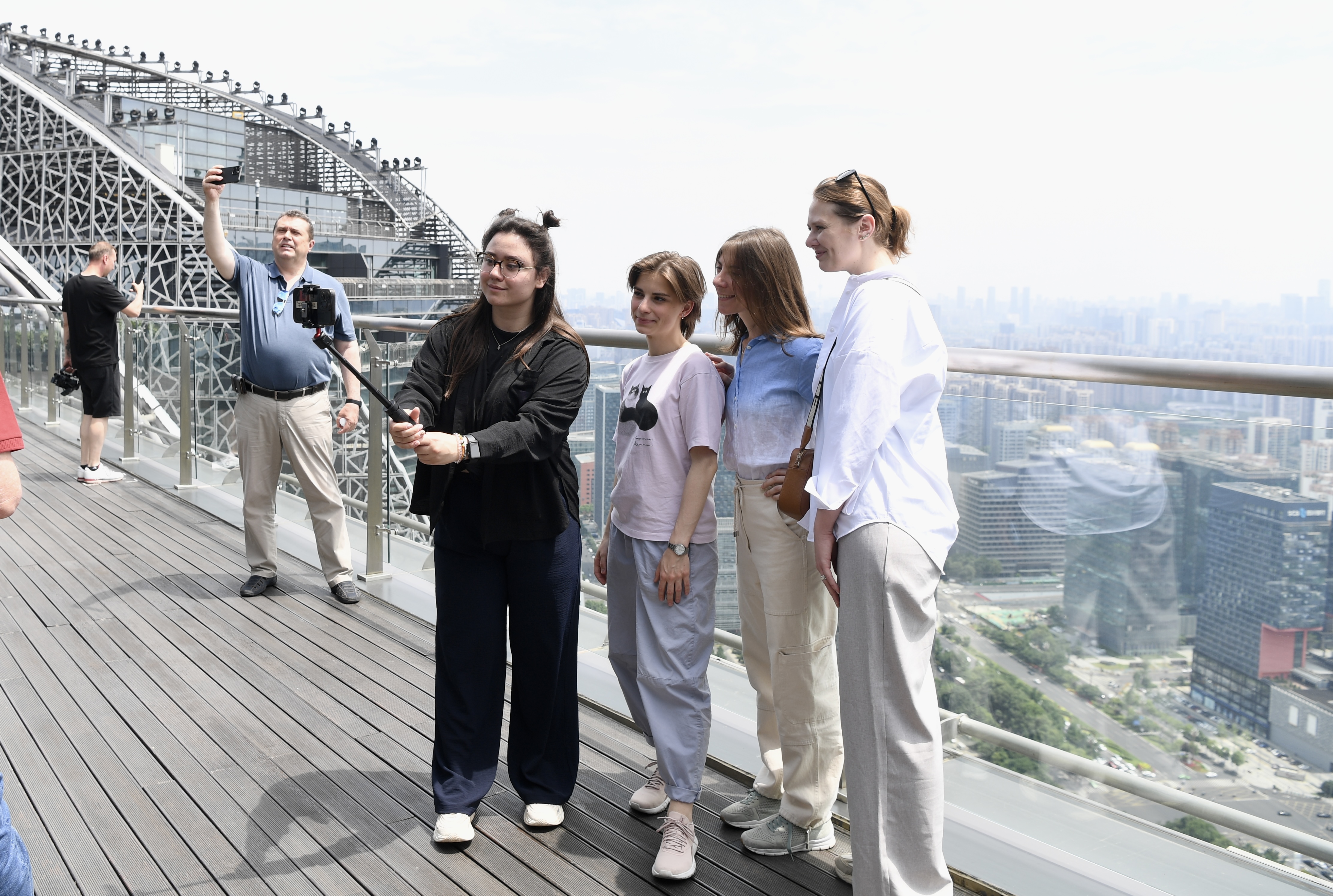 媒体代表们在天府双塔南塔的48层观景台拍照合影