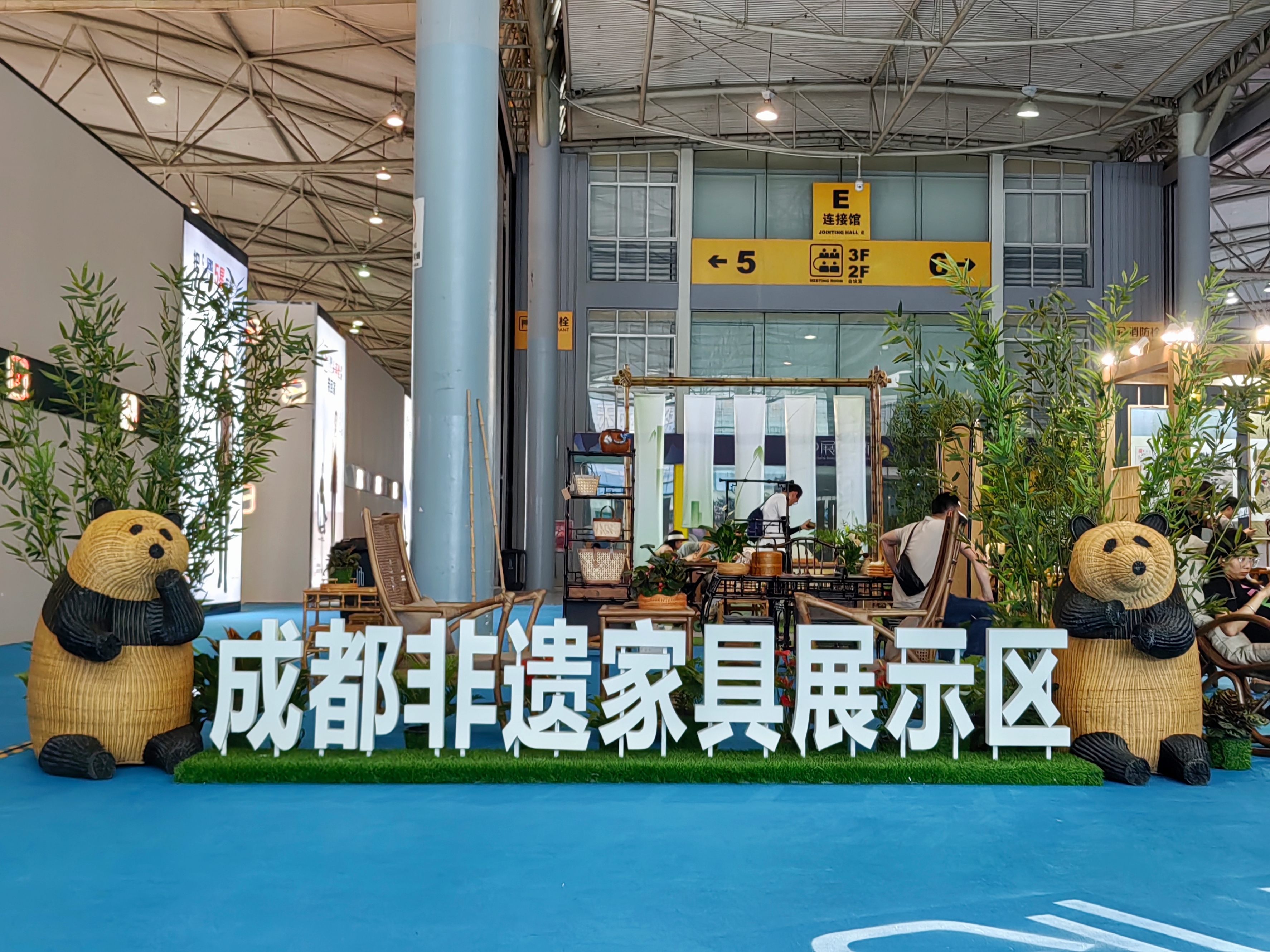尤其是在特别设置的“成都非遗家具展示区”,国家级非物质文化遗产与当代时尚家居完美融合。在该展区,邀请了专人现场展示传承千年的怀远藤编这一古老技艺,现场展示的藤编熊猫椅、花架等家具让现场市民惊艳不已。另外,蜀锦蜀绣也与现代家居摆件、挂画相融合,向人们展示了非遗在提升家居生活品味方面的无限创意。