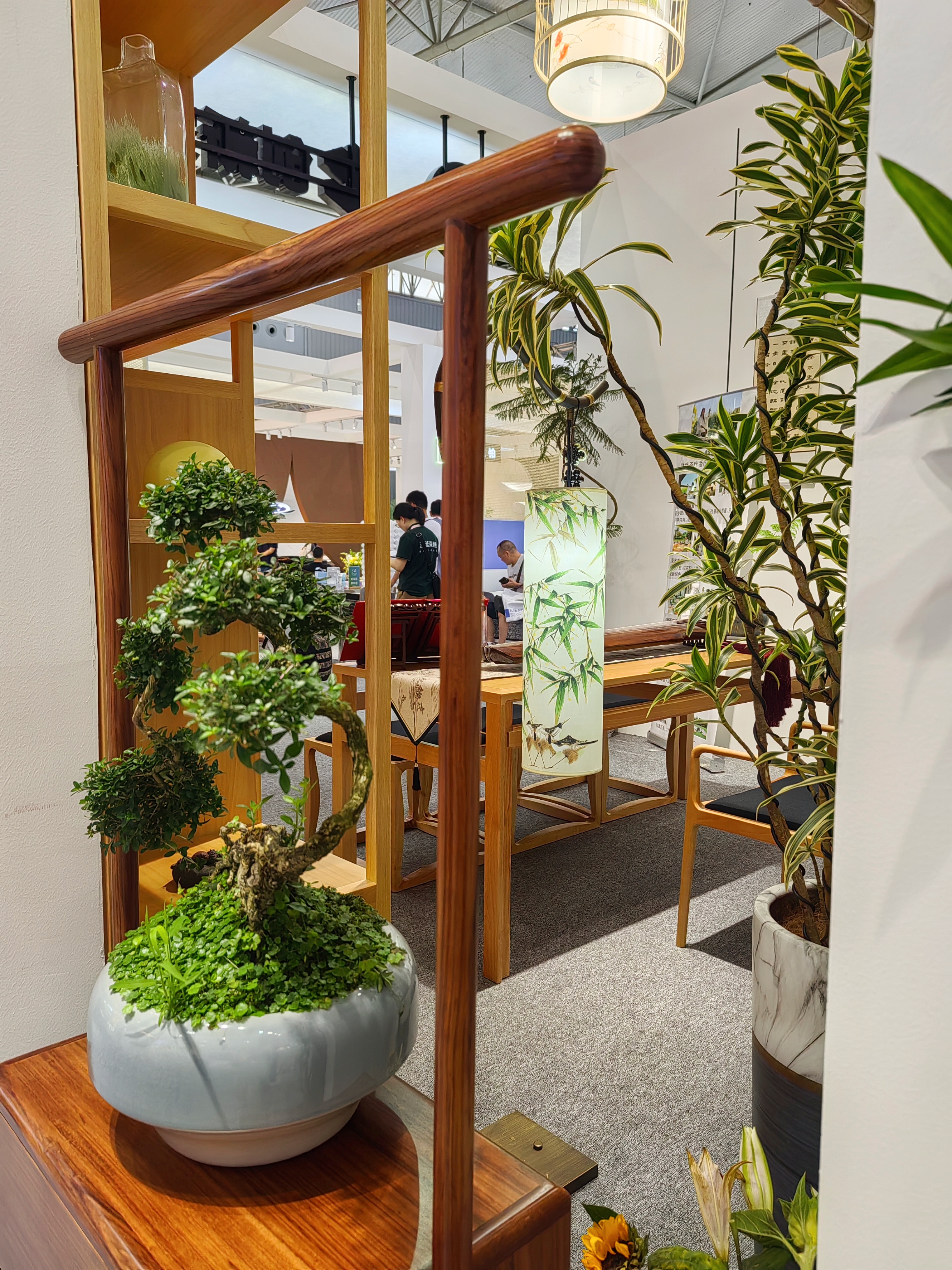 本届家具展除了展示家居新产品以外,还呈现了家居消费新场景。近几年,国风在各个领域渐起,家具行业也不例外。此次家具展上,便有专门以新中式为主题的创新家具展区。在该展区,藤编的坐垫、竹编的窗帘、实木的桌椅、绘着翠竹明月的立式灯……各类新中式家具构成了一组清新淡雅的中式风。