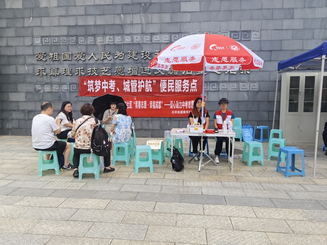 除了各个环节保障考试有序平稳推进的人员外,考点外的志愿者服务点位也发挥着巨大作用。在石室天府中学考点外的志愿服务点,石羊街道锦羊社区成立了中考服务保障组,在考试期间提供帐篷、凳子、饮用水、文具、防暑降温用品等,为考生及家长提供贴心服务和应急帮助。同时,社区也联动公安、城管、交警等部门力量,全力开展考点学校周边环境秩序整治,联合整治施工噪音、乱摆卖、车辆乱停放、车辆违规鸣笛等影响考场秩序的环境秩序问题,切实营造良好的考试环境。