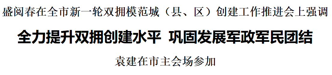 12月16日下午,全市新一轮双拥模范城(县、区)创建工作推进会召开。市委书记盛阅春强调,要深入学习贯彻习近平总书记关于双拥工作的重要论述和党的二十大精神,全面落实省、市党代会决策部署,全力提升双拥创建水平,巩固发展军政军民团结,奋力夺取省级双拥模范城创建“八连冠”,为争创全国双拥模范城“七连冠”奠定坚实基础。市委副书记、市长施惠芳主持。