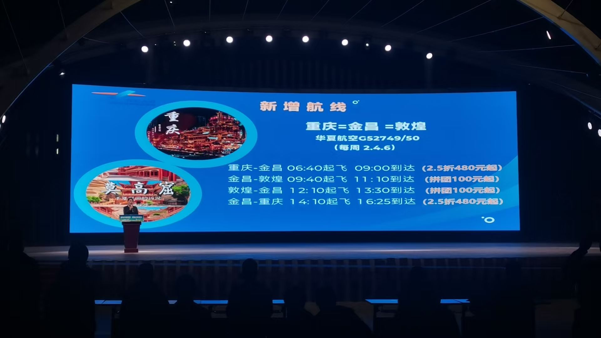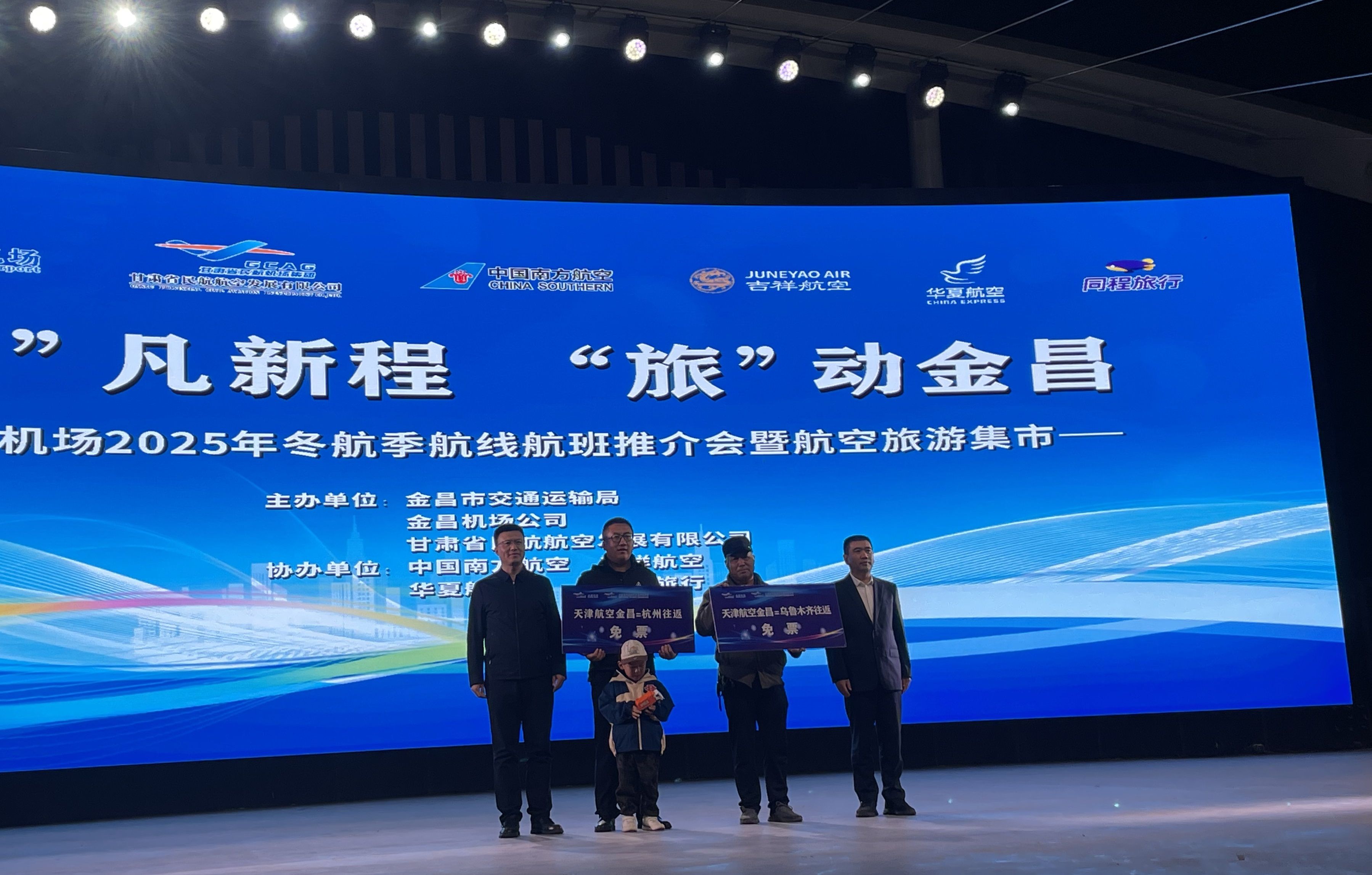 当晚19时30分,推介会正式启动。金昌市交通运输局、金昌机场公司、各航空公司、同程旅行等单位领导出席活动。启动仪式在精彩的文艺表演中开场,随后金昌机场就2025年冬航季新开通的“乌鲁木齐=金昌=杭州”、“重庆=金昌=敦煌”两条航线、优惠航旅产品以及“金畅行”服务品牌进行了重点介绍,生动展示了金昌机场在提升区域通达性、促进“航空+旅游”融合发展方面的积极成果。各航空公司也依次登台,介绍了新航季的航班安排与服务升级内容。