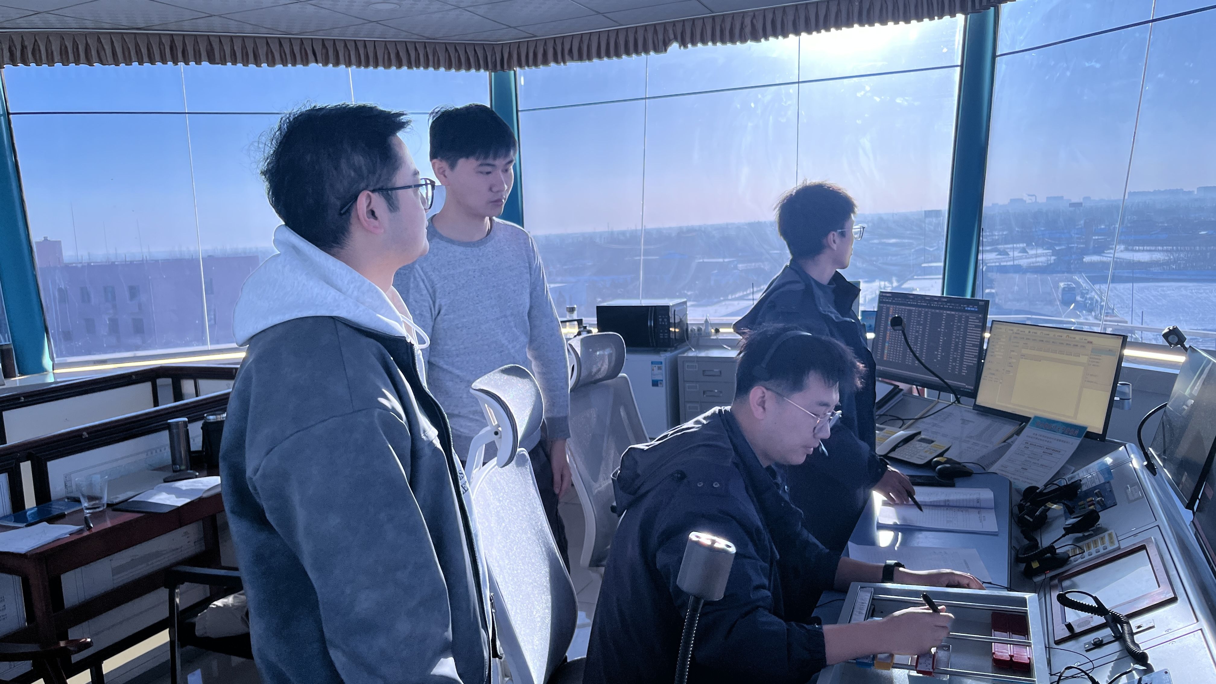 1月9日上午,华池南梁机场管制员在庆阳机场塔台交流学习。石昊龙 摄