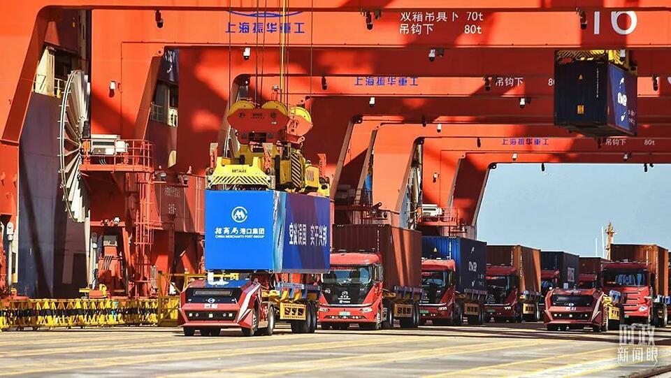△2021年11月14日,粤港澳大湾区首个5G绿色低碳智慧港口——妈湾港正式开港。港区全部采用“单车无人自动驾驶”操作。(图/视觉中国)