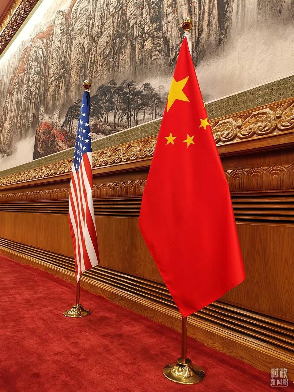 △视频会晤现场的两国国旗。(总台央视记者杨立峰拍摄)