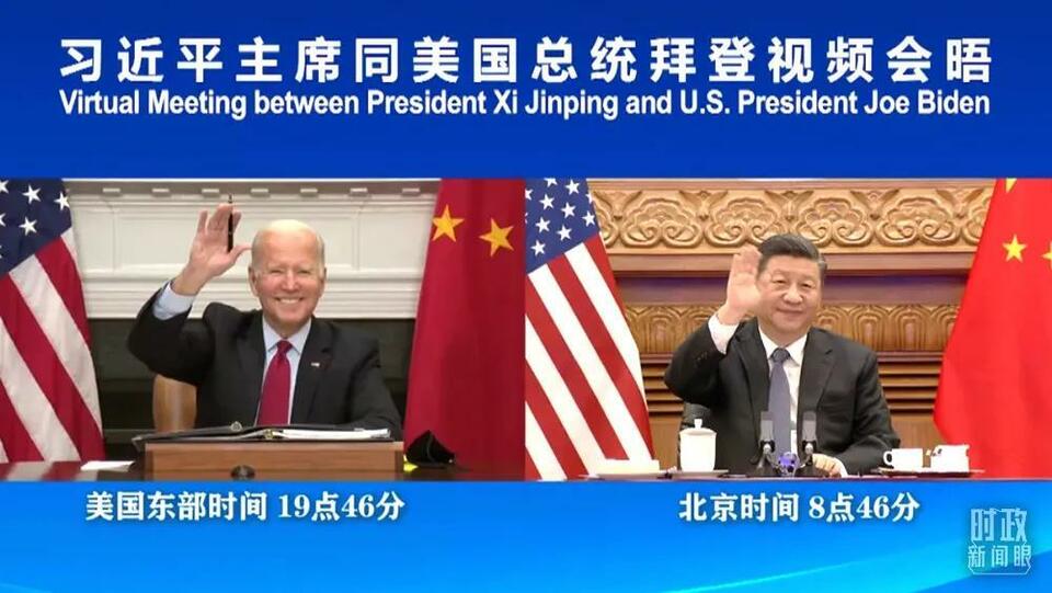 北京时间16日上午8点46分,华盛顿时间15日晚上19点46分,一场遥隔万里的视频会晤开始。一开场,两位领导人互相招手,微笑致意。
