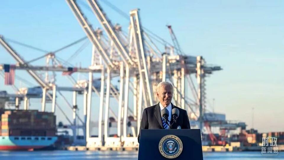 △2021年11月10日,拜登总统前往美国马里兰州的巴尔的摩港,谈论基建计划。他的演讲背景中,停有“上海振华重工”(ZPMC)制造的“新巴拿马式”起重机。(资料图)