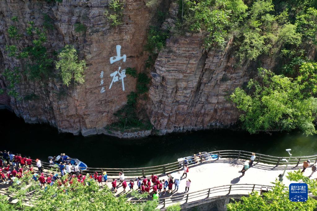 游客在河南林州红旗渠畔参观(2019年5月22日摄,无人机照片)。新华社记者冯大鹏摄