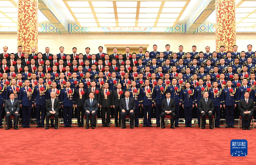 11月5日,党和国家领导人习近平、王沪宁、韩正等在北京人民大会堂会见全国应急管理系统先进模范和消防忠诚卫士表彰大会代表。新华社记者谢环驰摄