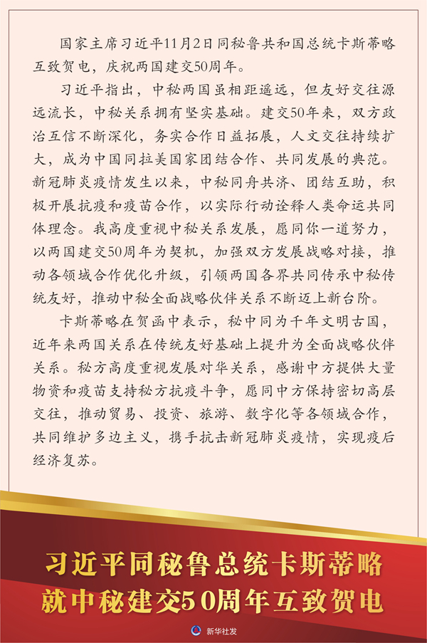 国家主席习近平11月2日同秘鲁共和国总统卡斯蒂略互致贺电,庆祝两国建交50周年。