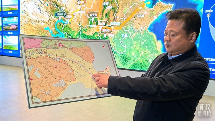 △黄河河口管理局局长裴明胜正在介绍黄河三角洲的防洪设施建设。(总台央视记者韩锐拍摄)