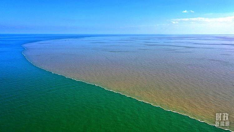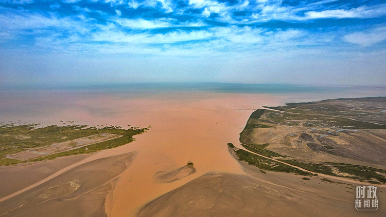 △俯瞰入海口,雄浑的黄河与碧蓝的大海相融。(总台央视记者程铖拍摄)