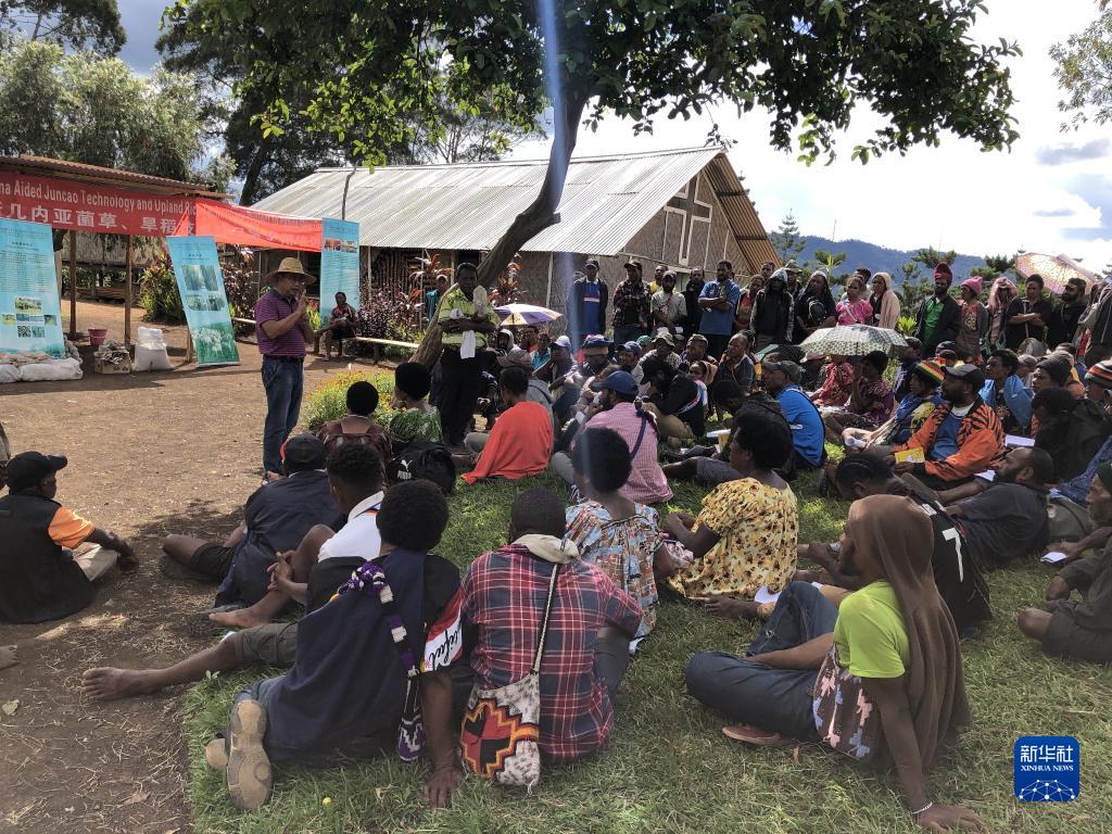 2020年12月15日,中国援巴布亚新几内亚菌草旱稻项目专家组组长林应兴(戴草帽者)在巴布亚新几内亚东高地省中国援助巴新菌草和旱稻技术项目第9期培训班上授课。新华社发