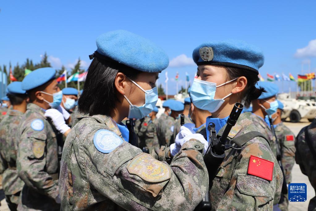 2021年6月16日,在黎巴嫩南部辛尼亚村中国维和营举行的授勋仪式上,接受检阅的维和女兵进场前互相整理着装。中国第19批赴黎巴嫩维和部队授勋仪式16日上午在黎巴嫩南部辛尼亚村的中国维和营举行,410名官兵全部被授予联合国和平勋章。新华社发(刘雄马摄)