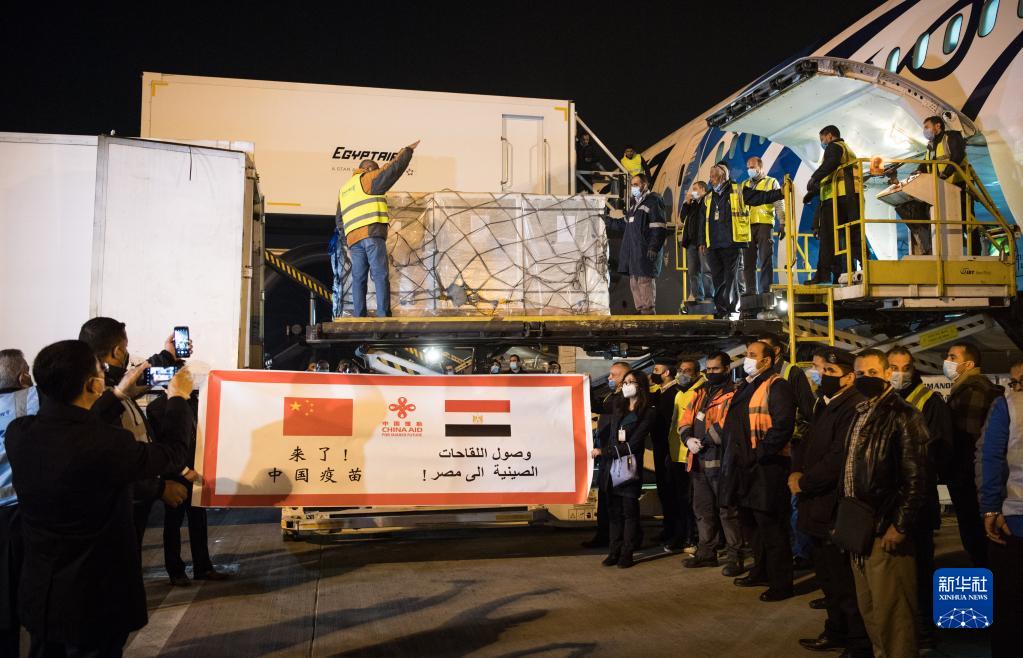 2021年2月23日凌晨,在埃及开罗国际机场,工作人员运输中国援助埃及的首批新冠疫苗。新华社记者邬惠我摄