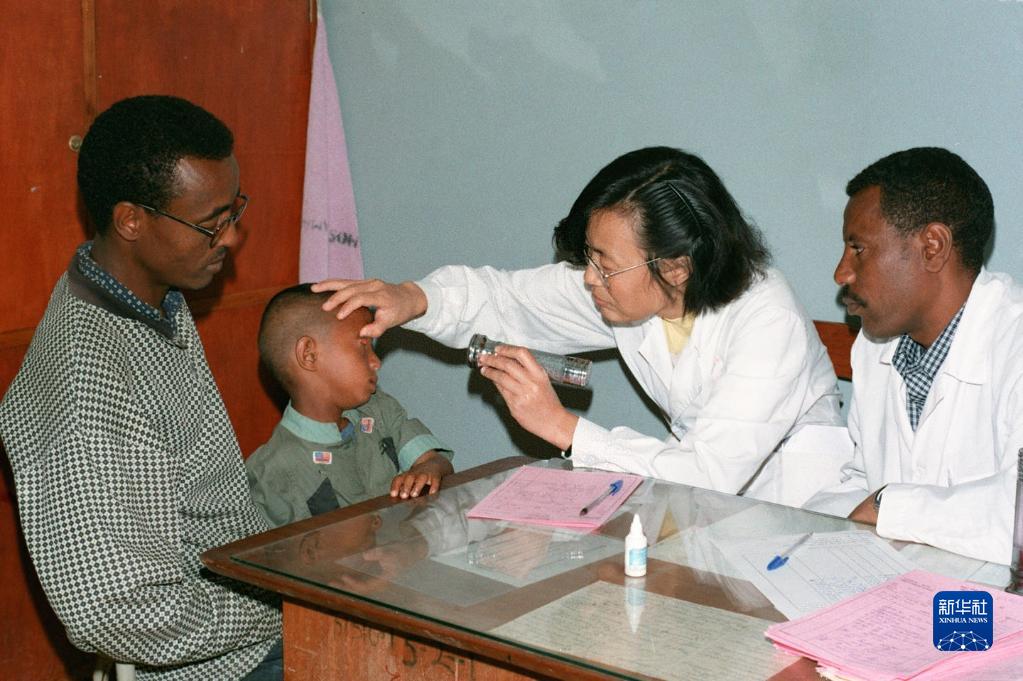 1998年,中国医疗队队长曹晓燕和当地医生一起给眼疾患儿检查。由河南省派出的中国第9批援埃塞医疗队于1996年8月赴埃塞俄比亚工作,他们以崇高的医德、精湛的医术赢得了当地人民的赞誉。新华社记者陈才林摄