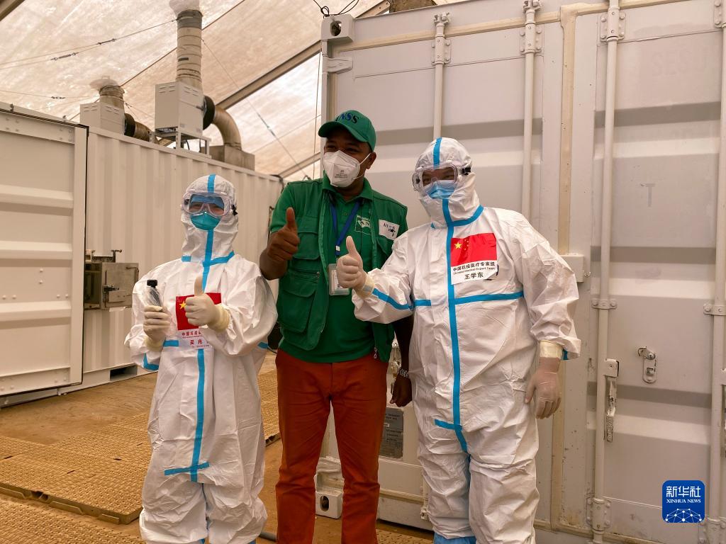 2020年9月2日,在几内亚首都科纳克里一个核酸检测取样点,中国抗疫医疗专家组成员与当地工作人员合影。新华社发(专家组供图)